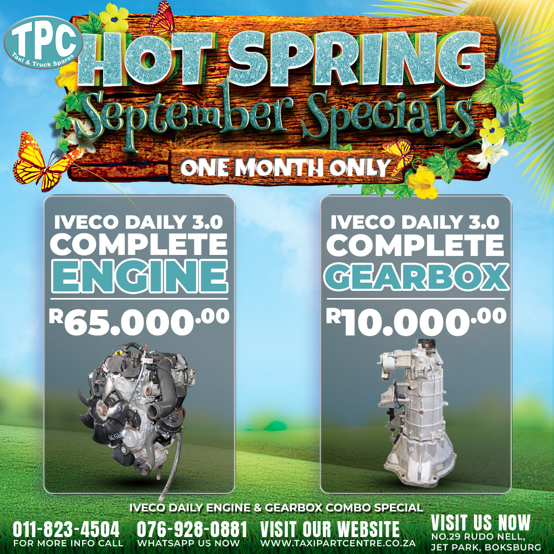 Welcome Spring with our one month only Hot Spring September Special with a Iveco Daily 3.0 Engine and Gearbox Combo for affordable prices. Get it now while stocks last.