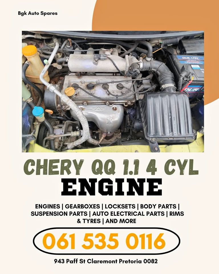 Chery QQ 1.1 4 cyl engine Need car spares? BGK Auto Spares sells quality used parts for most makes & models. New stock in regularly! Stop the search — call us today and we’ll sort you out. 📍943 Paff Street, Claremont, Pretoria 📞 0️⃣6️⃣1️⃣5️⃣3️⃣5️⃣0️⃣1️⃣1️⃣6️⃣