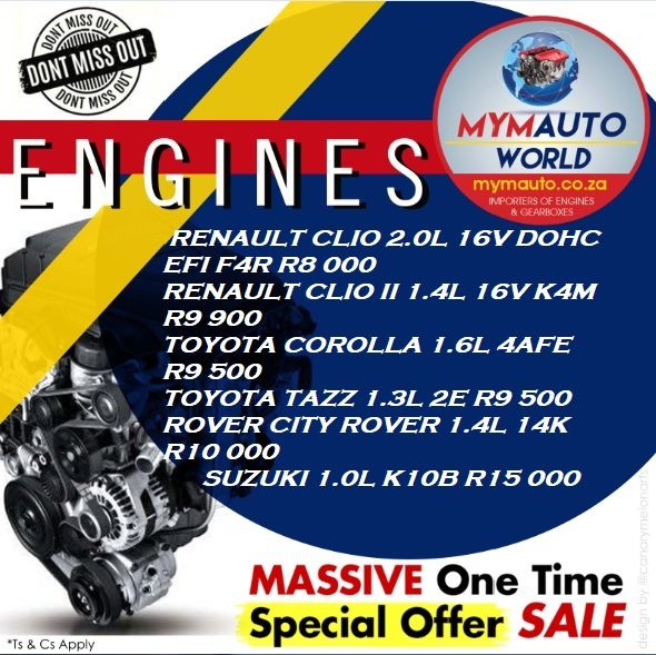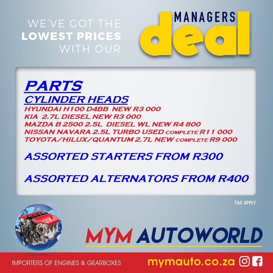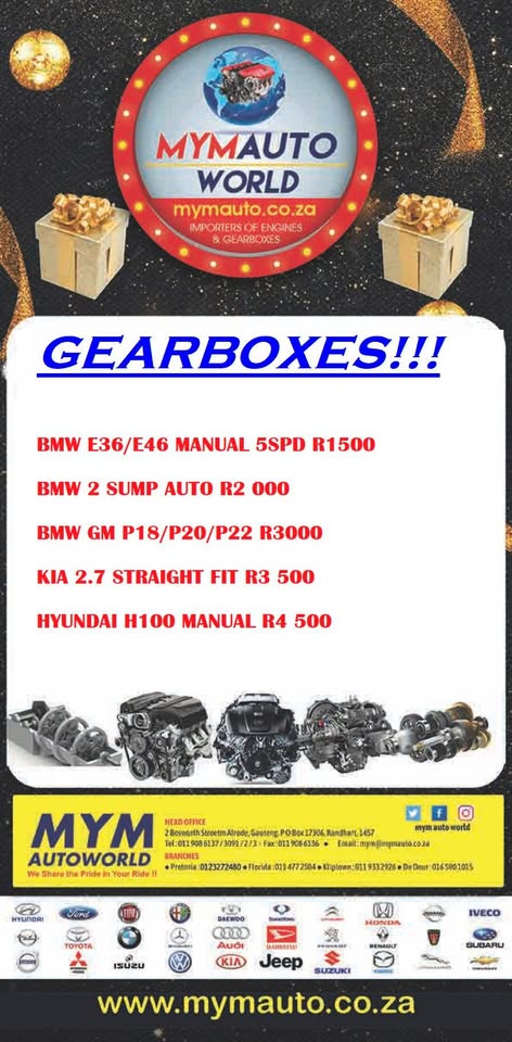 MYM AUTOWORLD IMPORTERS OF USED ENGINES AND GEARBOXES We take pride in giving you the #Lowestprices, #Bestquality, #Lowmileage, #Wideselection, #Secondhandengines!!! #Yes...we have the lowest prices for the best quality low mileage used engines and gearboxes in SOUTH AFRICA!!! #Yes again it' that time to #Save!!! SAVE BIG this week🔥 Come in and check our weekly specials Today!!!✔ SO...all you have to do is find us today!!! We stock a large variety of used low mileage engines and used low mileage gearboxes for all makes of vehicles such as, #Toyota, #Lexus, #BMW, #Mazda, #Mitsubishi, #Opel, #Ford, #Hyundai, #Volkswagen and #Subaru. Among-st a few models🙌 #ALBERTON: 2 BOSWORTH STREET ALRODE ALBERTON CONTACT US: [hidden information] #FLORIDA: [hidden information]/0600166491 622 ONTDEKKERS ROAD SHOP 12 PLAKA CENTRE #DEDEUR: [hidden information]/0600166491 16/90 MAIN ROAD DE DEUR 1884 #PRETORIA: [hidden information]/0600166491 417 WF NKOMO STREET(CHURCH STREET) PRETORIA WEST SALES TEAM: [hidden information] MICKEY, [hidden information]: OBAYD, FAIZAL 0600166491 0600166491: DESIREE, [hidden information]: IMRAAN, [hidden information]: JANICE, [hidden information]: SHAFIK, , LERATO [hidden information] *Payments via EFT and speed Point no cash on premises *Verify account number before making payment *Pictures for illustration purposes only *We can arrange country wide deliveries