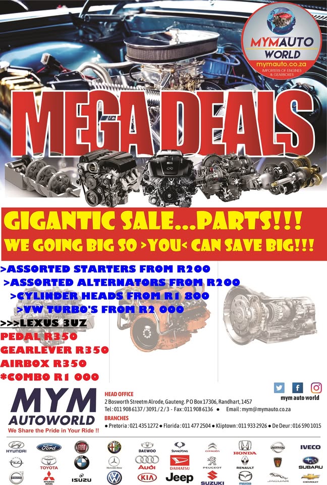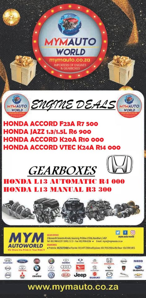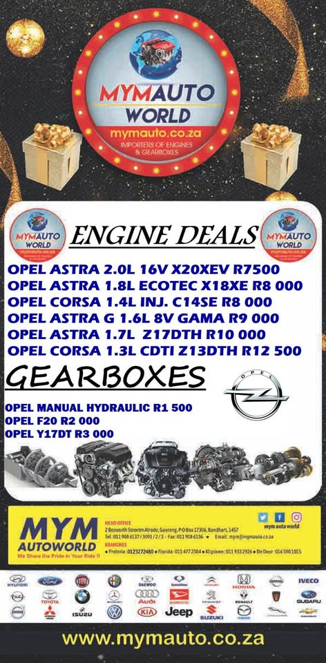 THIS DECEMBER>>>WE ARE OPEN>>>YES WE ARE OPEN>>>FIND US TODAY!!!! MYM AUTOWORLD IMPORTERS OF USED ENGINES AND GEARBOXES RELIABLE>>>THATS US👍 REASSURING YOU THAT WE HAVE THE BEST PRICES FOR THE BEST QUALITY ENGINES👌 RESTORING YOUR PEACE OF MIND THIS DECEMBER>>>LET US HELP YOU GET YOU CAR BACK ON THE ROAD SAFELY✌ WE READY ARE YOU???? WE ARE OPEN >>>>YES THIS DECEMBER (EXCLUDING PUBLIC HOLIDAYS) HELPING YOU GET YOUR CAR BACK ON THE ROAD SAFELY👌 >>>FOR EVERYTHING ENGINES THERE IS US😁 BECAUSE >YOU< COME FIRST WE CUTTING OUR PRICES!!!🙋♂️ NOT LOUD ENOUGH??? 📢 LET US HEAR YOU SAY....BEST PRICES....GREAT QUALITY....EXCELLENT SERVICE....💥 FIND US NOW!!! WE GOT WHAT YOU NEED JUST TELL US WHAT YOU NEED!!! >>>COME IN AND EXPLORE>>>MASSIVE DISCOUNTS IN STORE NOW!!!💥 WE GOT YOU COVERED>>>IT'S MASSIVE....GREAT SELECTION OF ENGINES TO CHOOSE FROM ..😲👀 YES YOU READ THAT CORRECTLY YOU CAN CHOOSE >>>WE HAVE A WIDE SELECTION OF ENGINES TO CHOOSE FROM #AlfaRomeo, #BMW, #Chev, #Daewoo, #Honda, #Hyuandai, #Isuzu, #Kia, #Landrover, #Mazda. #Mercedesbenz, #Nissan, #Opel, #Subaru, #Suzuki, #Toyota, #Volvo, #Volkswagen ITS MASSIVE>>>>DONT MISS IT!!!😎 We take pride in giving you the #Lowest prices, #Best quality, #Low mileage, #Wide selection, #Secondhand engines!!! >>>WHAT ARE YOU WAITING FOR???🤷♂️ WE TURNING UP THE VOLUME>>>don't miss out JUST Find us Today!!! #ALBERTON: 2 BOSWORTH STREET ALRODE ALBERTON CONTACT US: [hidden information] SALES TEAM: [hidden information] MICKEY, FAIZAL [hidden information], SHAFIK [hidden information],OBAYD [hidden information], DESIREE: [hidden information], [hidden information]: IMRAAN, [hidden information]: JANICE, , LERATO [hidden information], ESSOP [hidden information] #FLORIDA: [hidden information]/0600145591 622 ONTDEKKERS ROAD SHOP 12 PLAKA CENTRE #DEDEUR: [hidden information]/0600145591 16/90 MAIN ROAD DE DEUR 1884 #PRETORIA: [hidden information]/0600145591 417 WF NKOMO STREET(CHURCH STREET) PRETORIA WEST #KLIPTOWN: [hidden information]/0600145591 3495 TAKOLIAS CENTRE, SHOP4 KLIPSPRUIT VALLEY RD *Payments via EFT and speed Point no cash on premises *Verify account number before making payment *Pictures for illustration purposes only *We arrange country wide deliveries