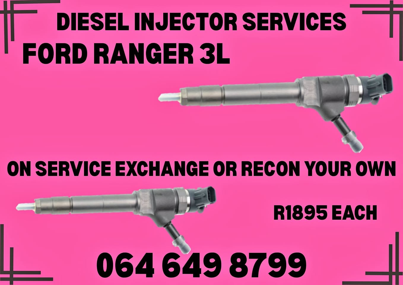 Power loss, Black smoke, Hard start, unusual engine loss, engine misfire... Time to replace your injectors, Let me help you! Other services include: Injector or Pump testing. Refurbishment of pumps, Refurbishment of Injectors 6 Months Guarantee With branches across South Africa we can help you with a smile. Call / WhatsApp me, Thea @