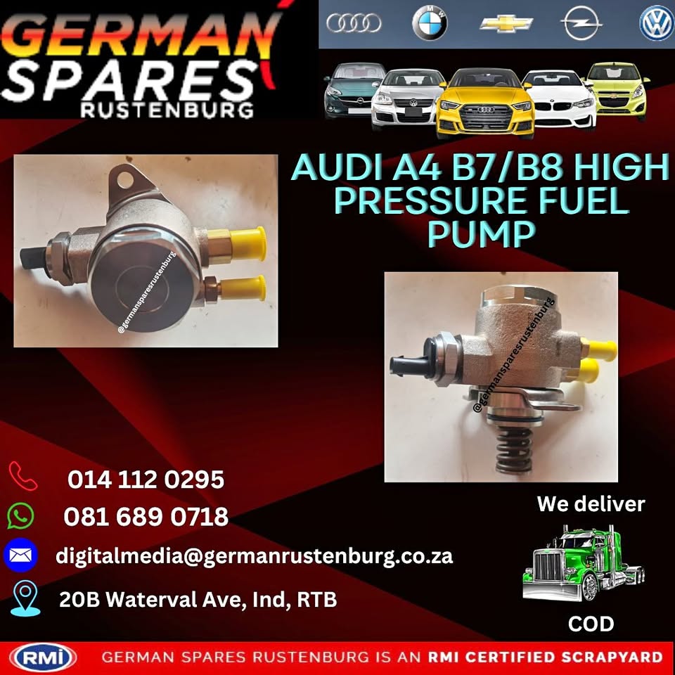 Audi A4 B7/B8 High Pressure Fuel Pump For Sale. (NEW) Contact Lincoln on Landline : Email : German Spares Rustenburg 20 Waterval Avenue Industrial - Rustenburg www.germansparesrustenburg.co.za We specialize in new & used Bmw, Audi, Vw, Chev, Opel & Ford Parts & Spares