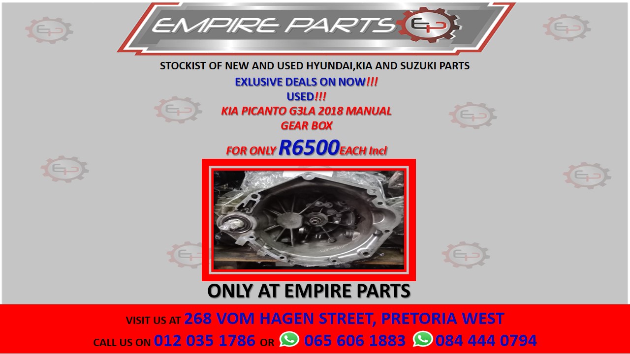 KIA PICANTO G3LA 2018 MANUAL GEARBOXPrice - R6500.00Make - KiaCondition - UsedContact Empire Parts for more information.
