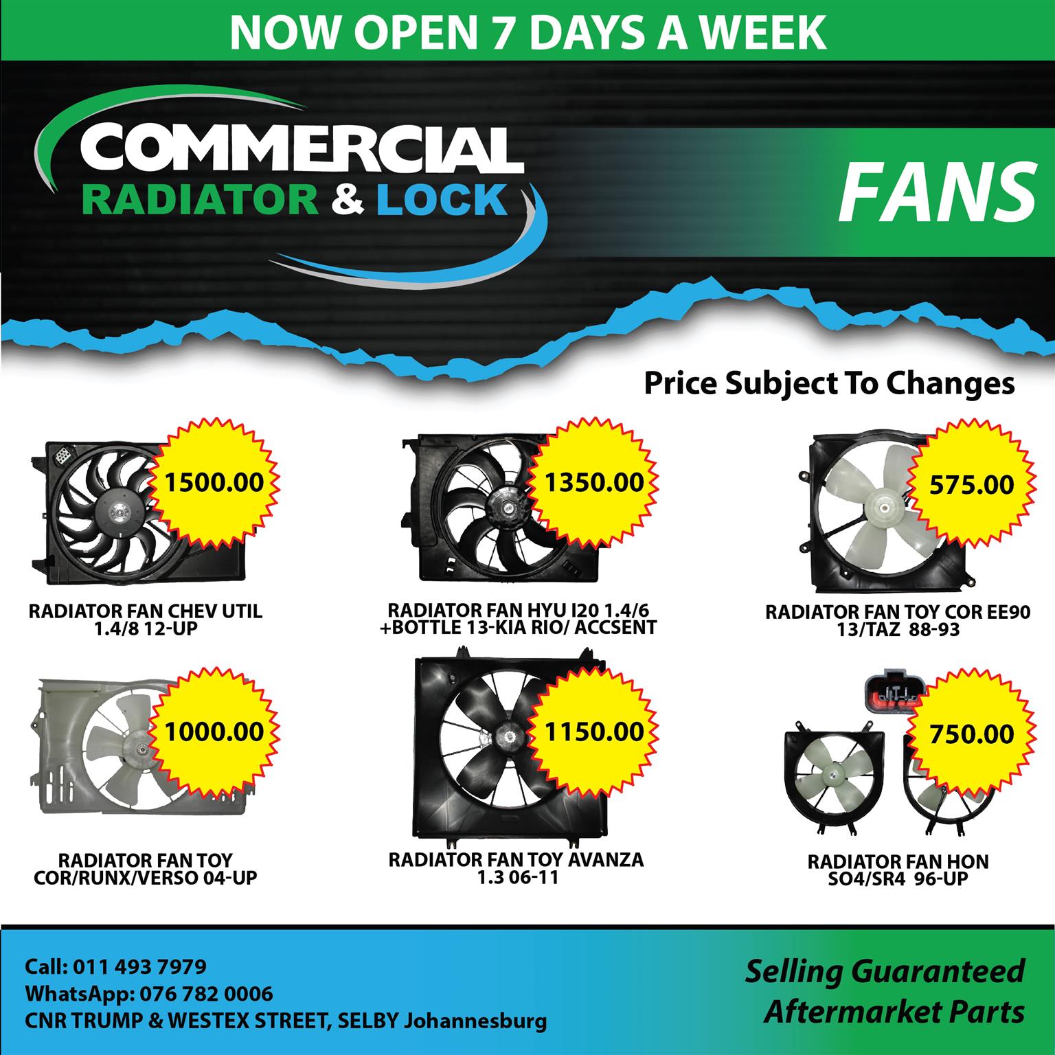 Get the Best quality Fans for many makes and models. Selling Guaranteed Aftermarket Radiators; Locks; Mags and MORE! Now we are Open 7 Day a Week!!!