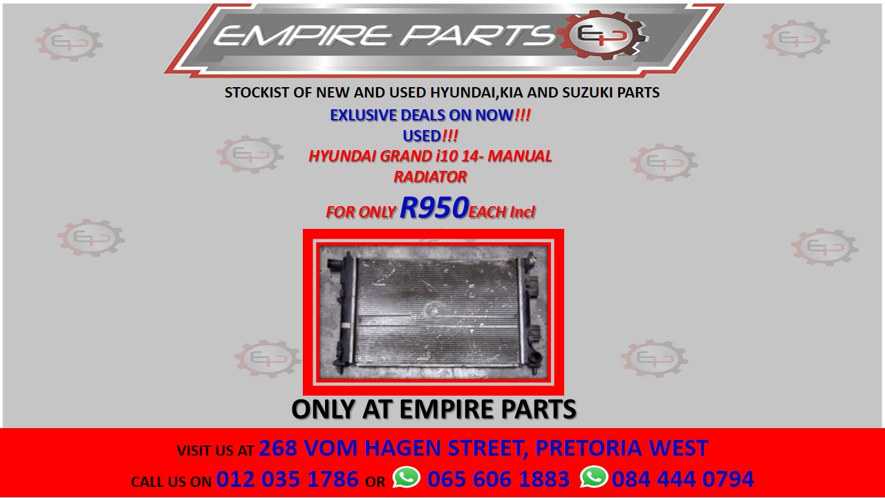 HYUNDAI GRAND i10 14- MANUAL RADIATORPrice - R950.00Make - HyundaiCondition - UsedContact Empire Parts for more information.