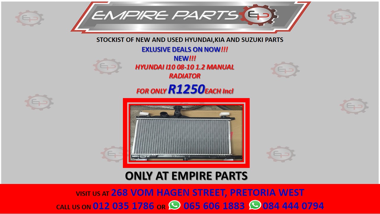 HYUNDAI I10 08-10 1.2 MANUAL RADIATORPrice - R1250.00Make - HyundaiCondition - NewContact Empire Parts for more information.