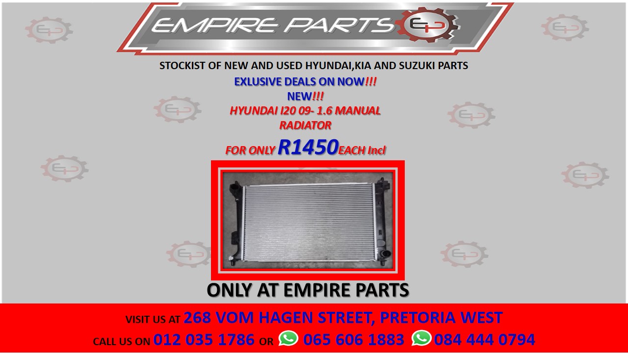 HYUNDAI I20 09- 1.6 MANUAL RADIATOR . More details:Price - R1450.00Make - HyundaiCondition - NewContact Empire Parts for more information.