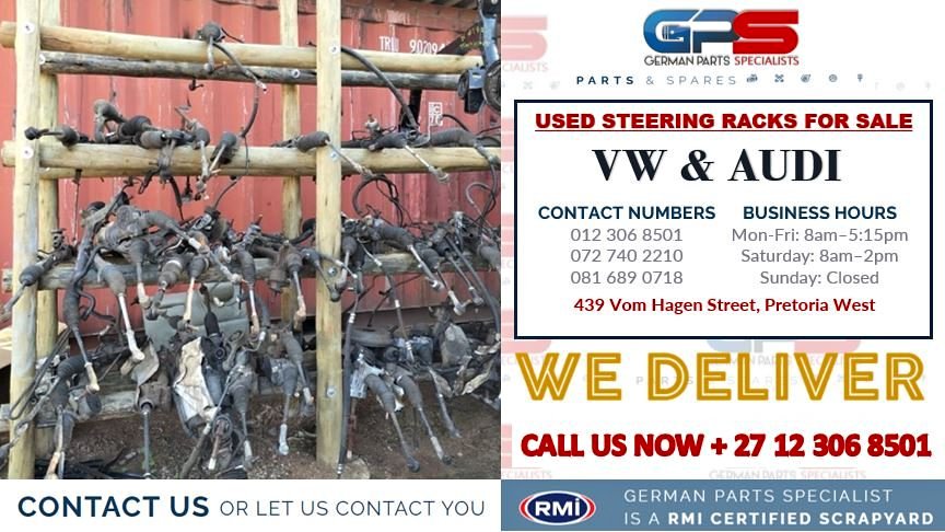 USED REPLACEMENT STEERING RACKS FOR VW & AUDI GERMAN PARTS SPECIALIST • Second-hand used quality spares • Audi & VW Volkswagen vehicles for stripping / breaking for spare parts • New aftermarket quality parts • Parts store / Automotive scrapyard • RMI certified scrapyard • We deliver (Gauteng surrounding areas) CASH ON DELIVERY AVAILABLE • Courier nation wide • We will buy your damage or running vehicle Business hours Mon-Fri: 8am–5:15pm Saturday: 8am–2pm Sunday: Closed Contact numbers- Landline: 012 306 8501view more https://wa.me/+27727402210view more https://wa.me/+27816890718view more 439 Vom Hagen Street, Pretoria West.