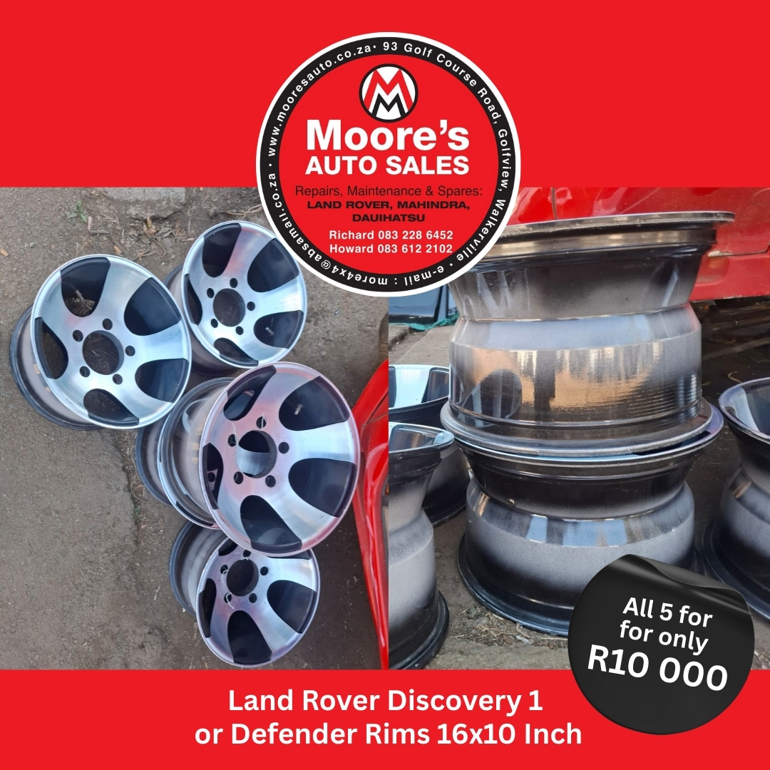 Land Rover Discovery 1 or Defender Rims 16x10 Inch all 5 for R10000.00https://www.mooresautosales.co.za/