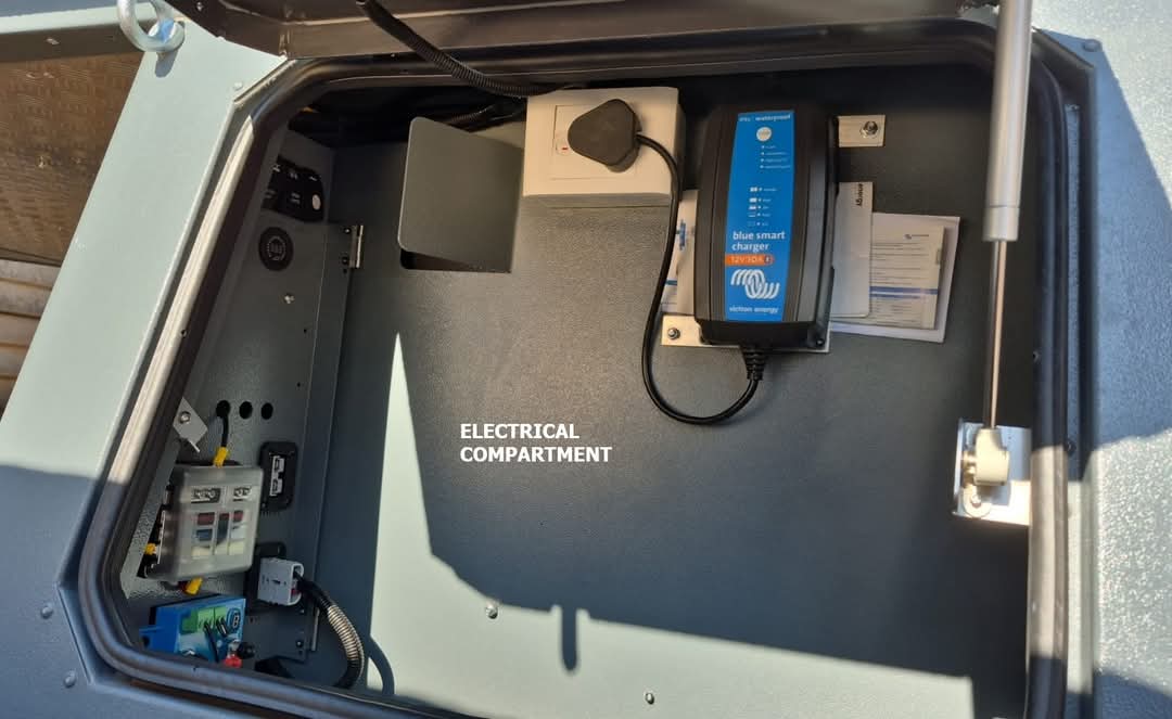 *RHS kitchen with fold-out table, and cutlery organiser *LHS storage box for 15A Victron charger, DC/DC - MPPT, Smart Victron Shunt