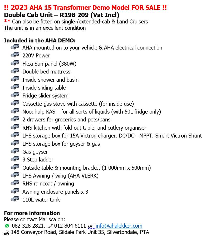 2023 AHA 15 Transformer Demo Model FOR SALE !! Double Cab Unit -R198 209 (Vat Incl)