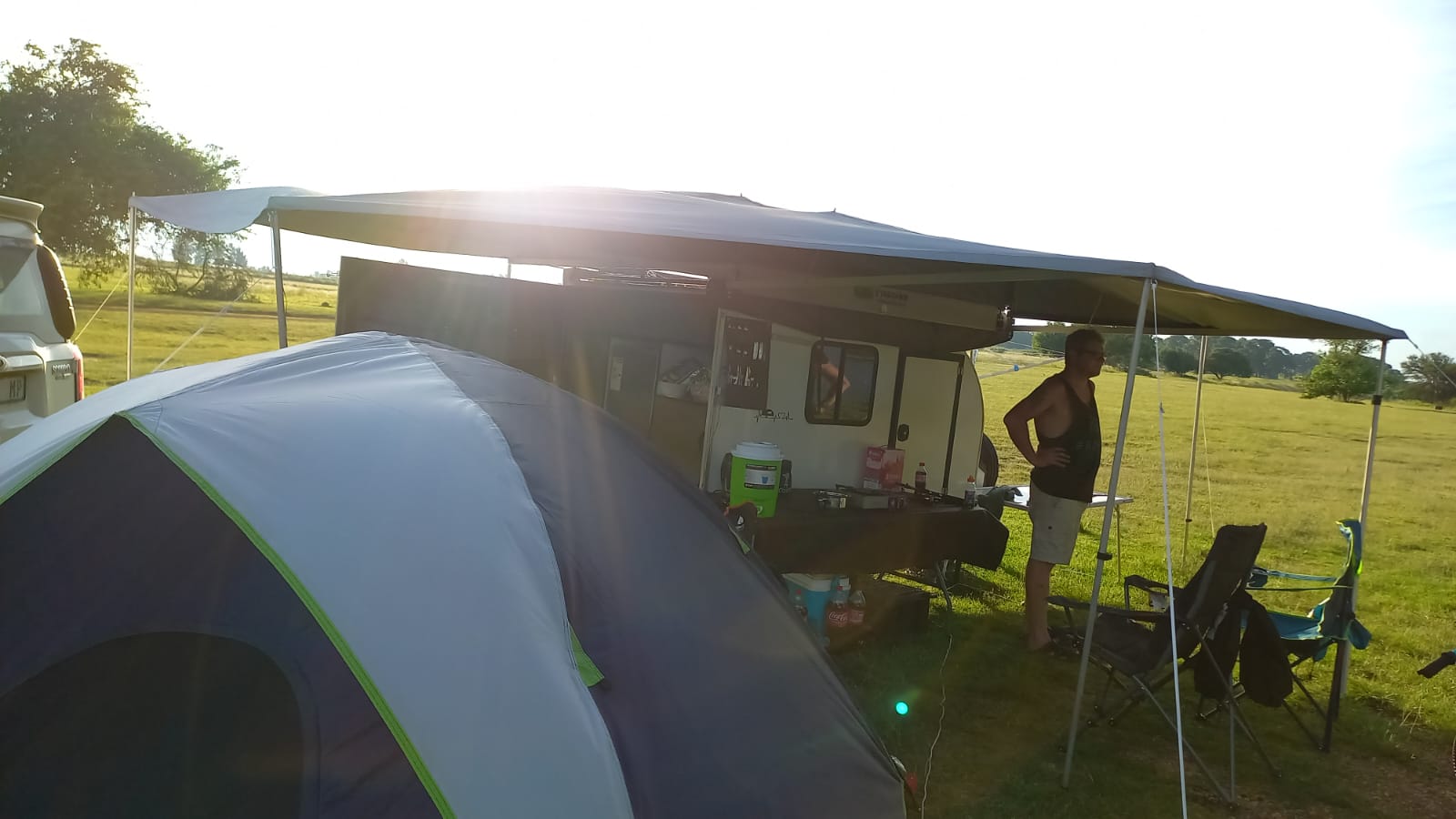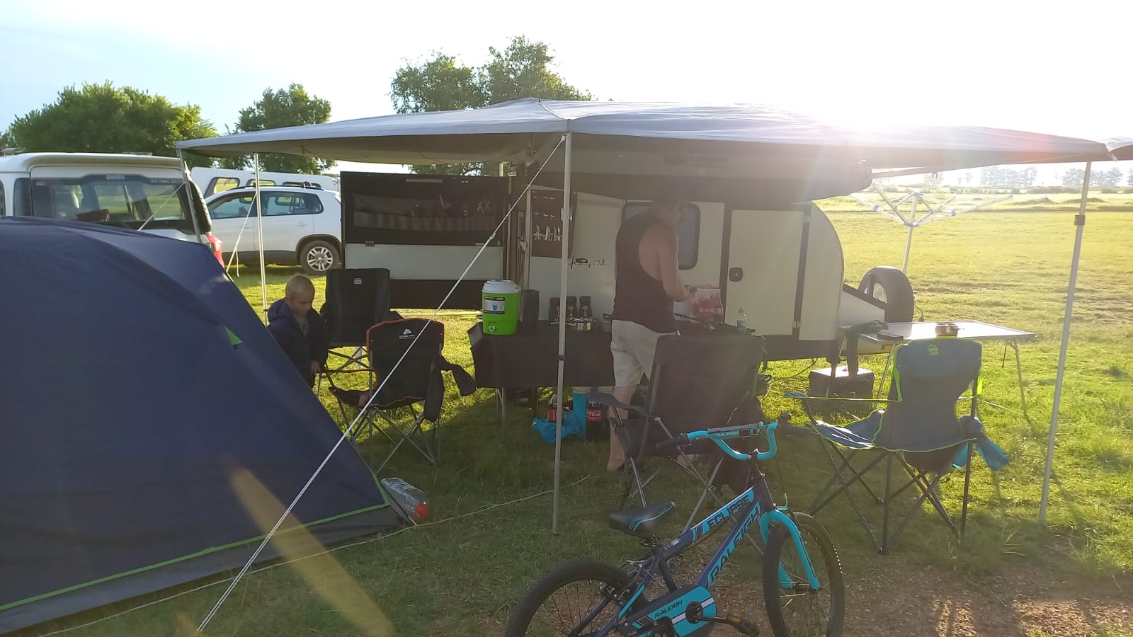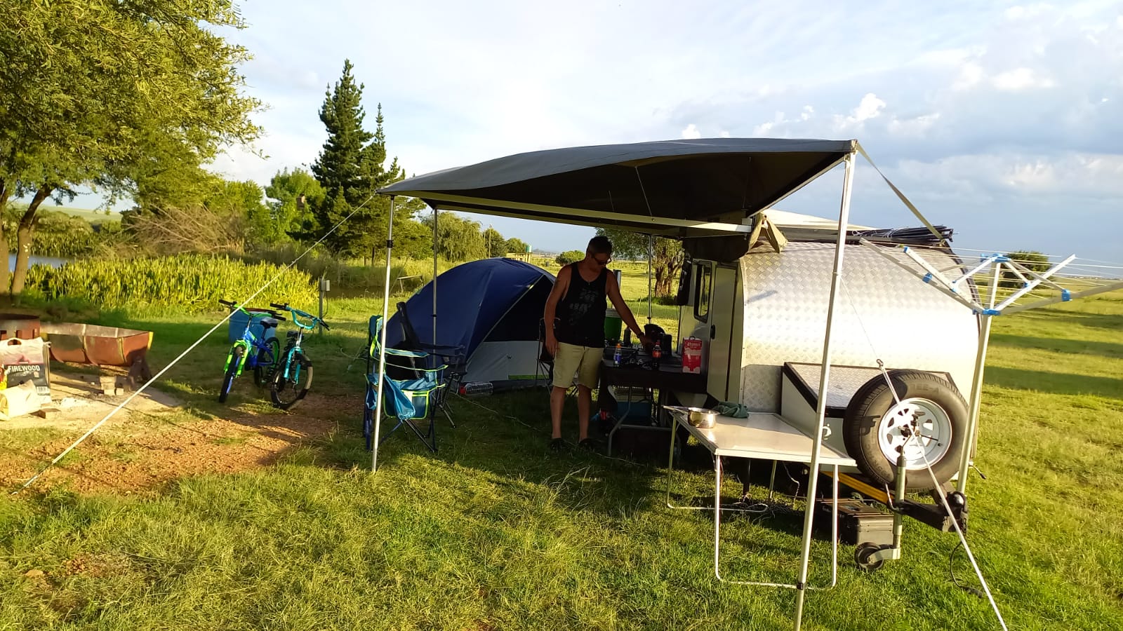 Dis is n Kamp trailer met n dubbel bed in en geen kamp goedere word ingesluit behalwe die batwing awning en die trailer se pale en tent aan die ander kant van die trailer die yskas...