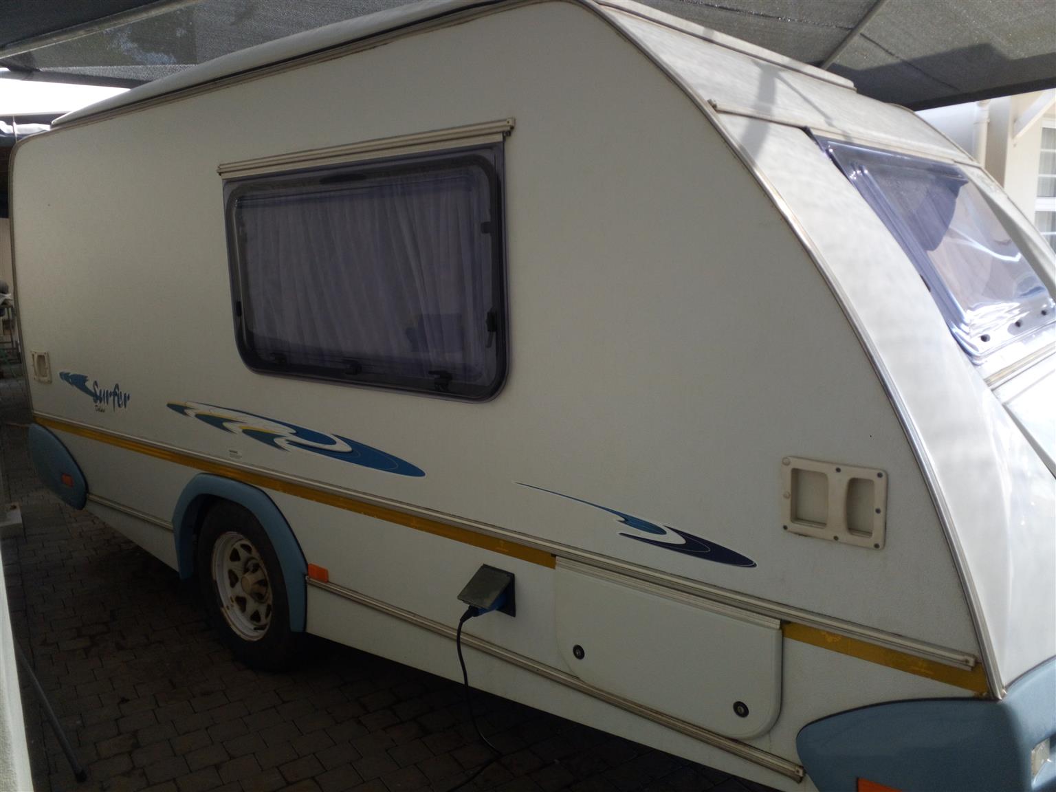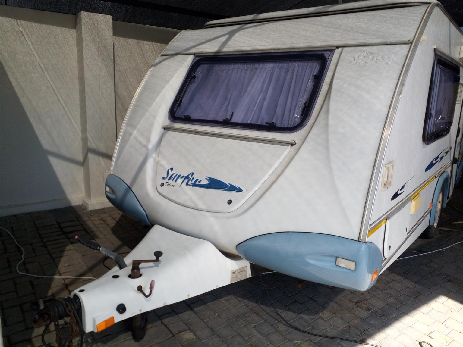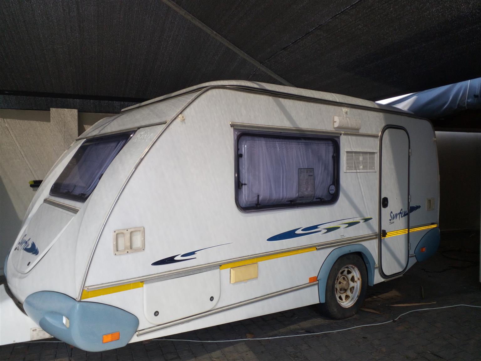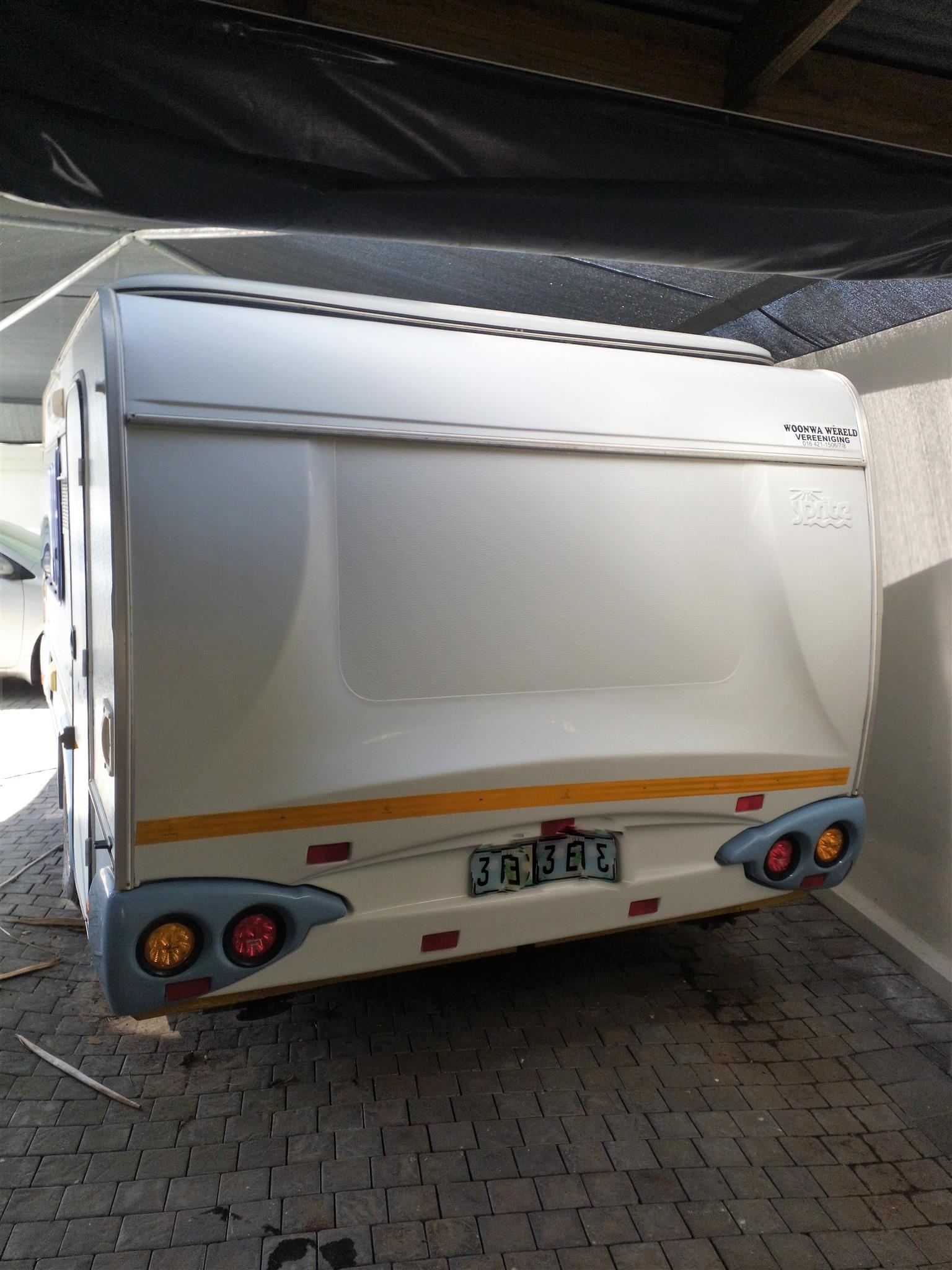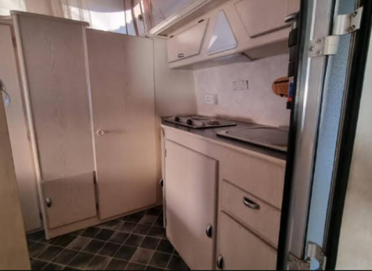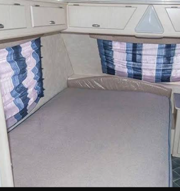 This caravan is great for couples or a small family with older children as it has two add a rooms for either side. It has a full tent which doubles up as a rally as all sides zip on and off. It also has an additional roof and two sides which zip onto the front of the full tent, the front can then be zipped onto the addition which makes the closed in living space double the size. Inside it has a washroom/wetroom (toilet, basin and hand held shower) with geyser, also a fridge, microwave, two plate gas cooker and sink. Also has a travel blanket for the front. Licensed till August 2023.
