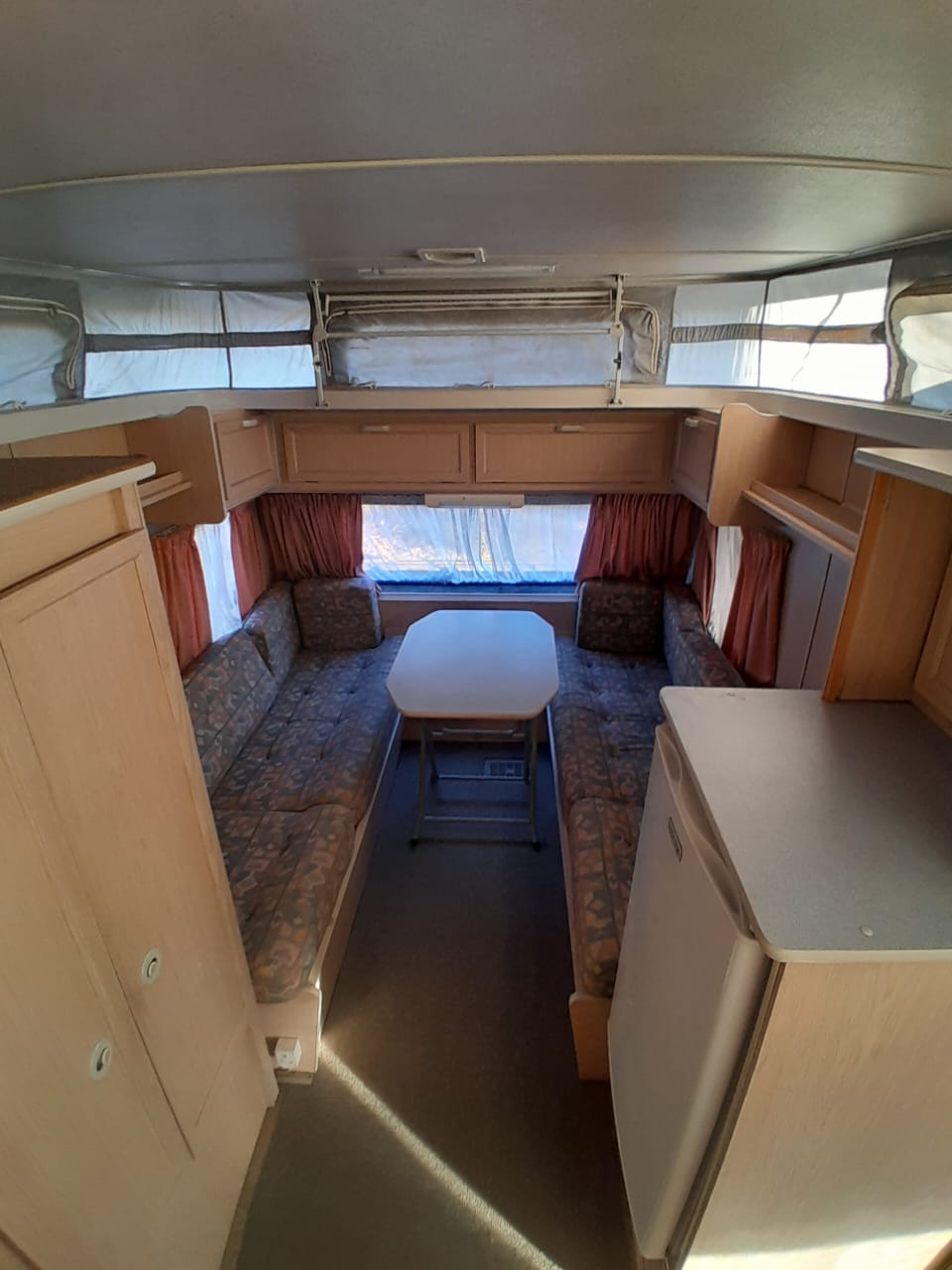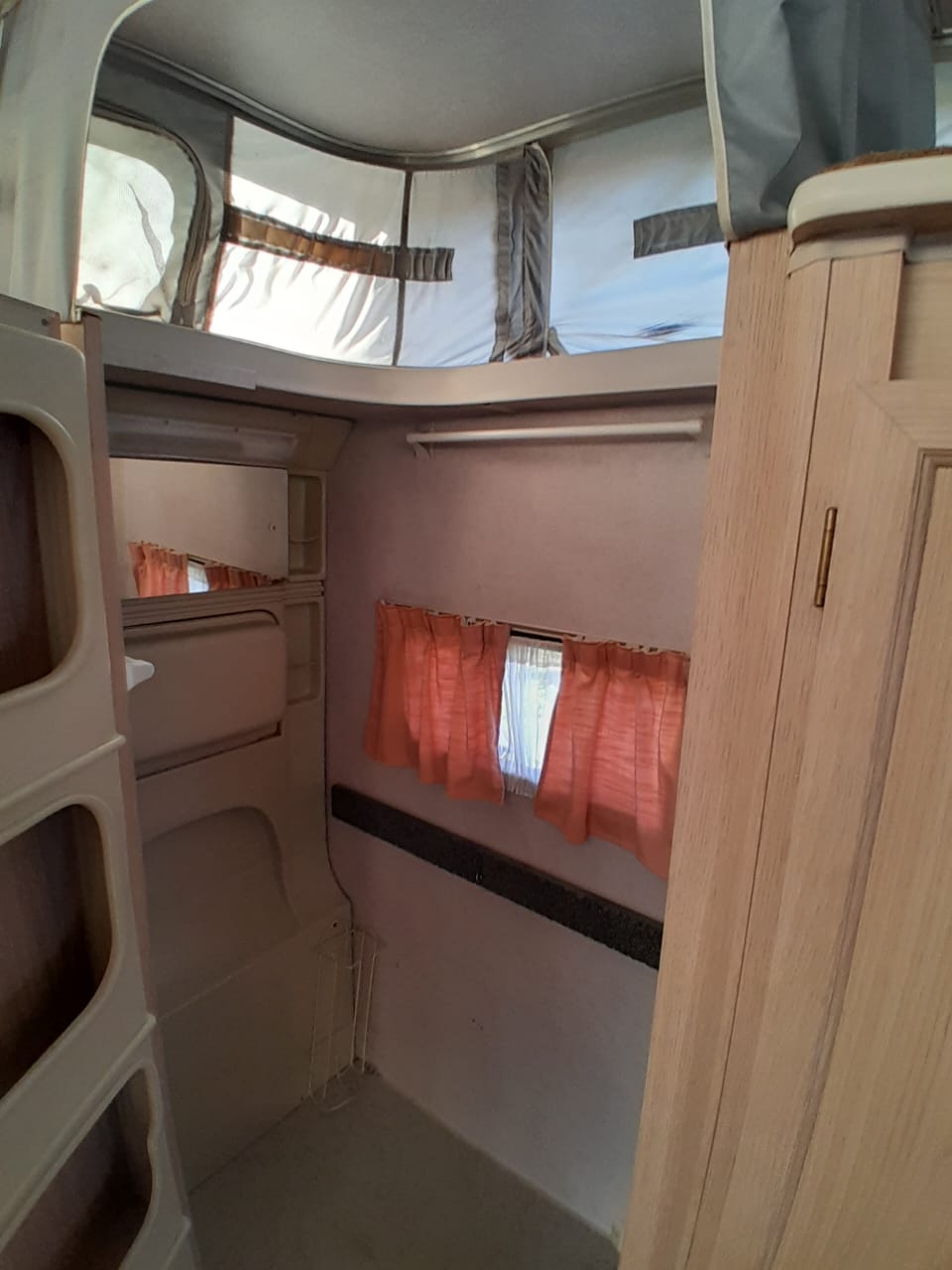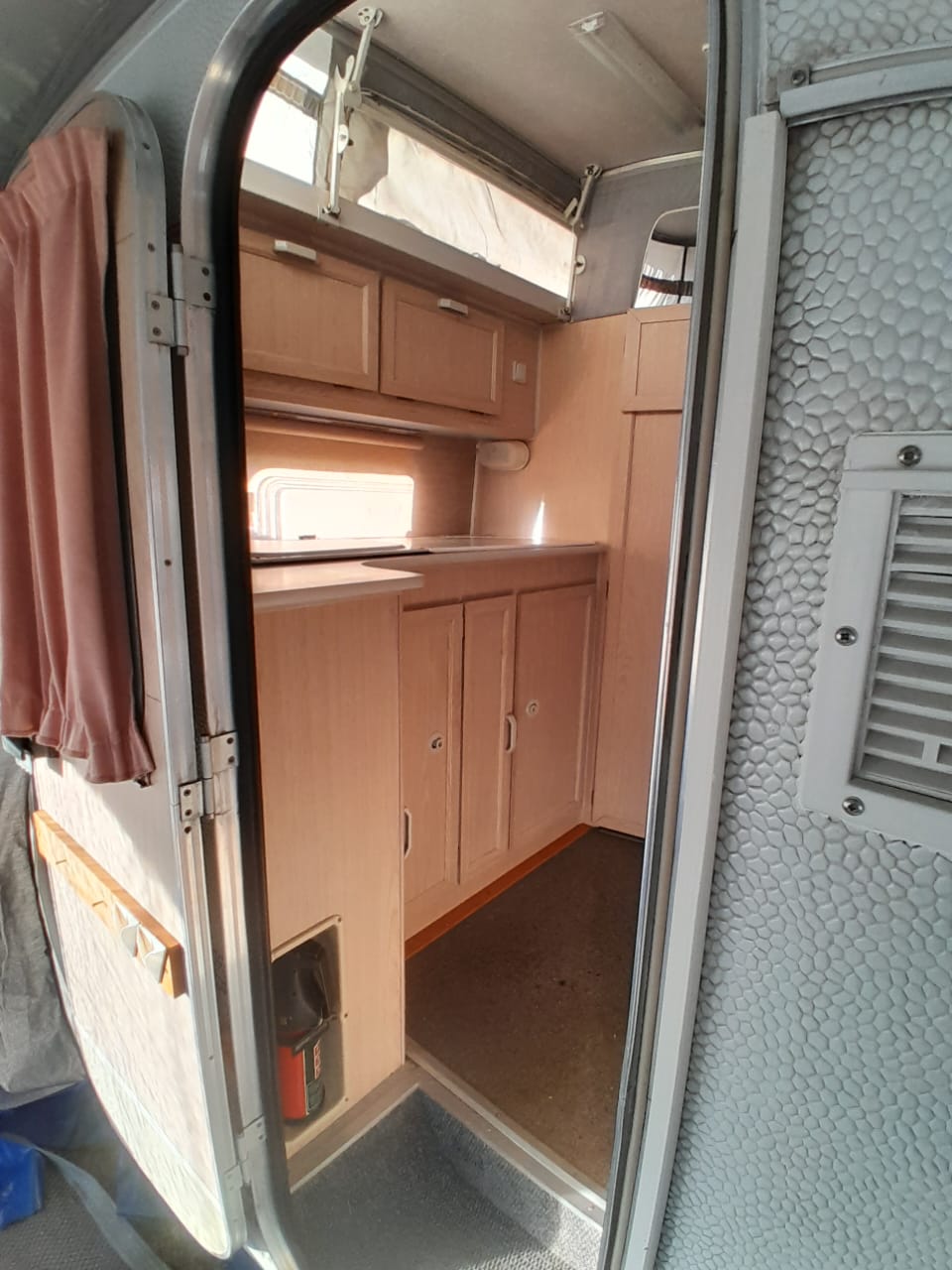 The caravan has one really large double bed in the front or you can keep it as two single beds, the caravan has got it original table and basin.