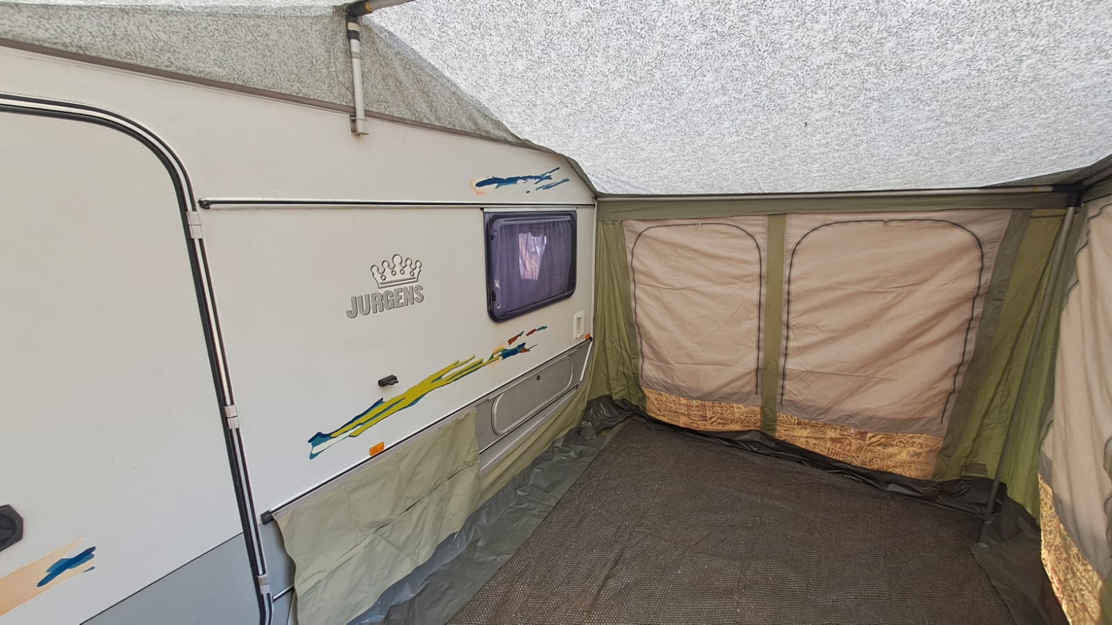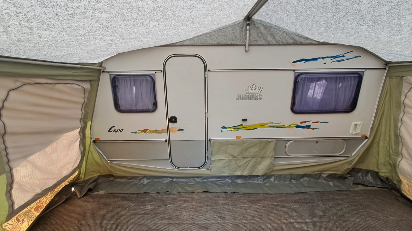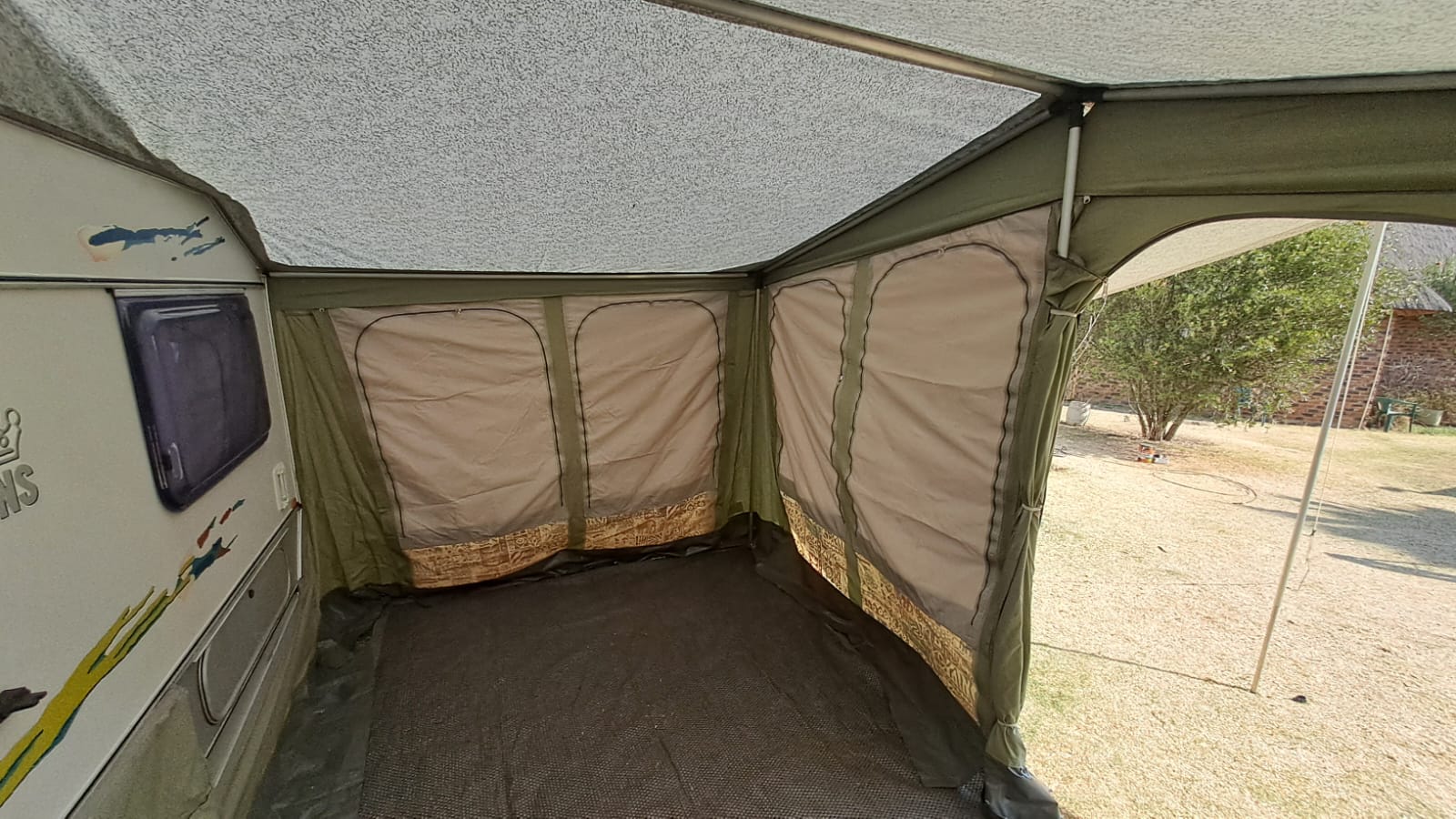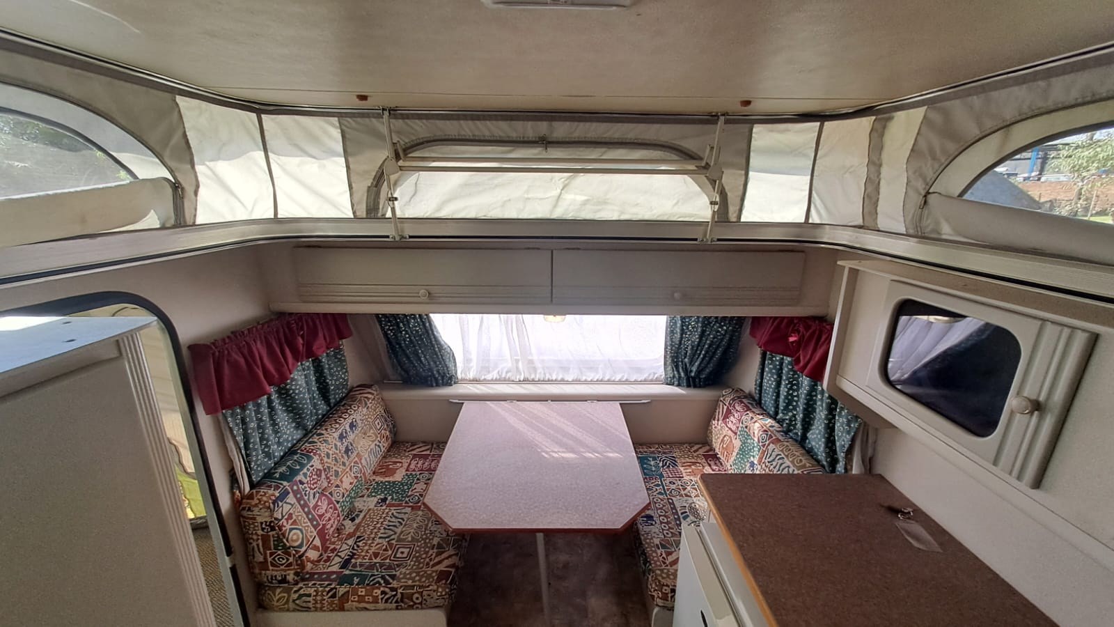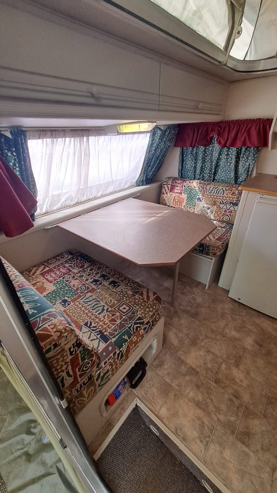 The caravan has a double bed in the back and a single bed In the front that converts Into a dining erea that can seat 2 people.