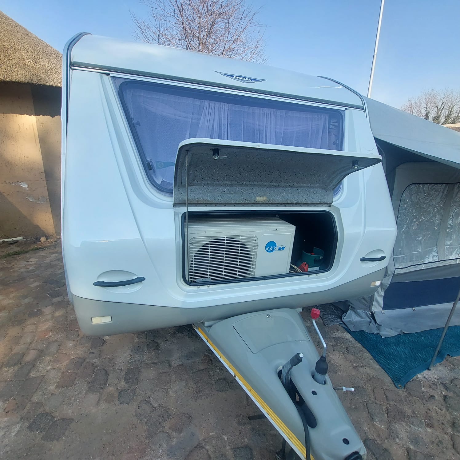Trade-ins welcome *072*775*3523* beautiful caravan in excellent condition ready for camping. Included is a full modular tent as well as additional tent extension and add-on sides with groundsheet and all necessary poles,ropes and pegs for the tentwork. Inside the caravan there is a upgraded large double door fridge freezer fitted as well as a aircon. Fitted in the kitchen area you have got a microwave as well as a gas stove and wash up basin which has never been used included is also a full set of original crockery. The caravan has got a complete on sweet bathroom with a built-in serviceable toilet as well as a shower with hot and cold water throughout the caravan thanks to the built in geyser which can run on gas or electricity. The caravan has got a built-in water tank with water pump as well as a water level indicator the pump can also run on a battery therefore making a hot shower possible with no electricity needed. The caravan has got a Island bed in the front as well as a dining area with dining table in the rear. All standard accessories included the caravan is fully licensed and I have got the paperwork on hand contact me anytime to arrange viewing I am situated in benoni