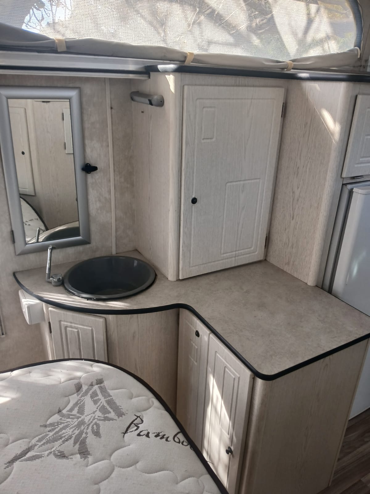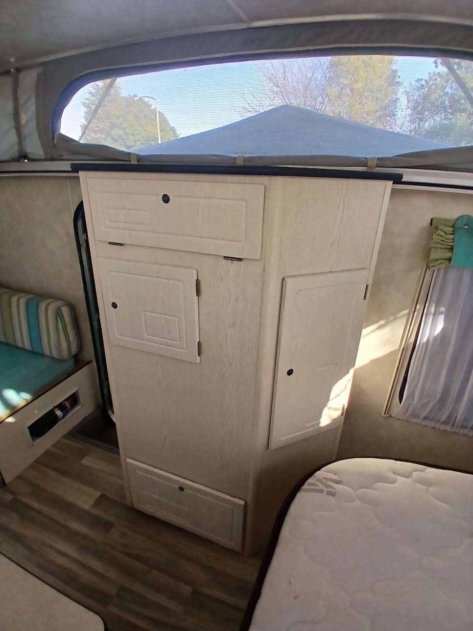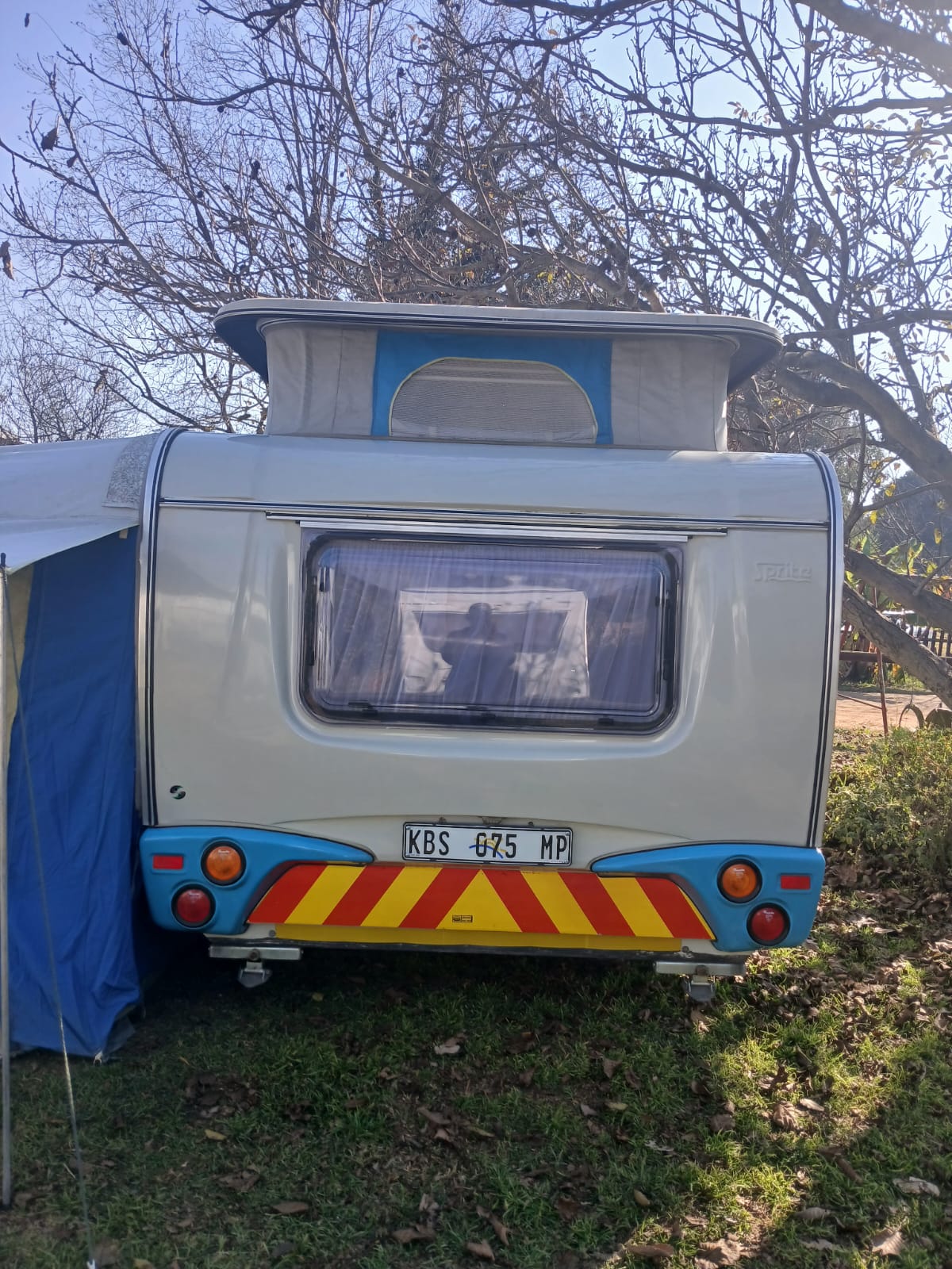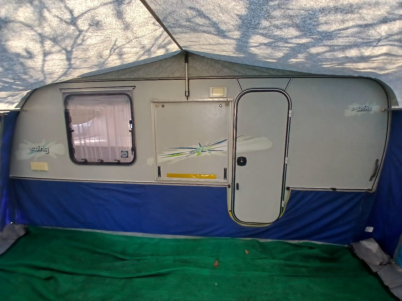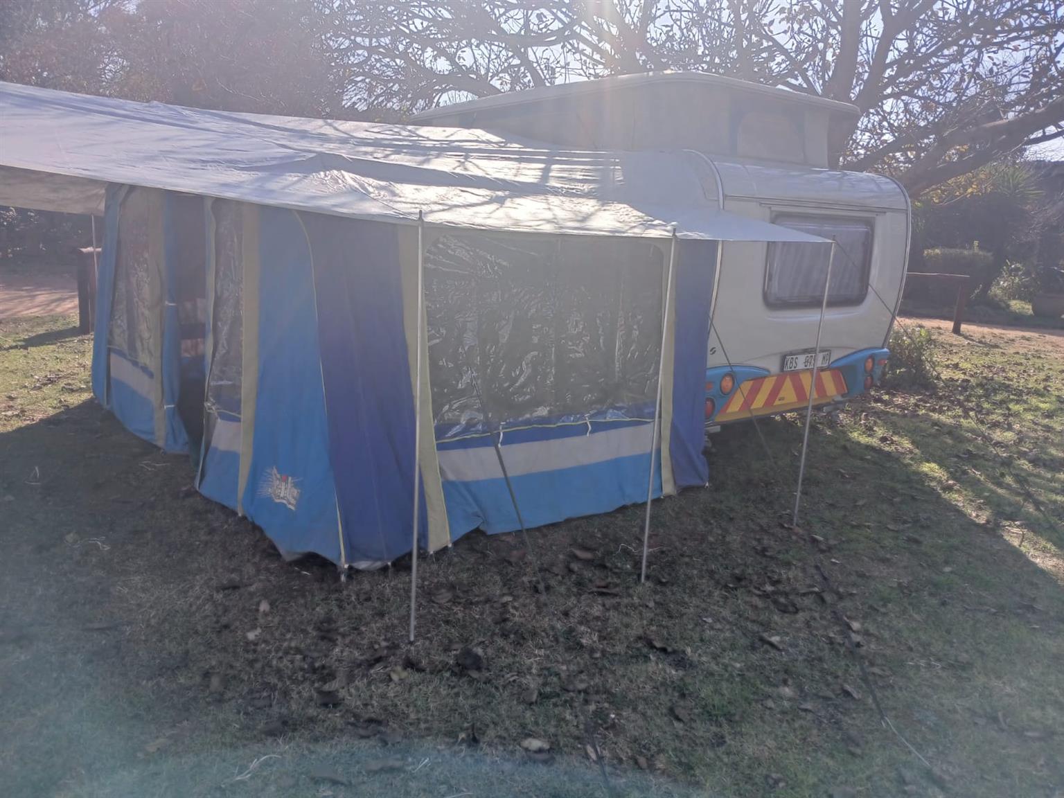 Caravan in excellent condition ready to camp with aircon fitted as well as brand new tires just fitted. The caravan has got a complete out side kitchen consisting of a large drop-down working surface fitted in outside kitchen you have got your two plate gas stove as well as a washup basin with microwave installed and packing space for all cutlery and crockery. The caravan comes complete with a full tent in excellent condition with ground sheets and all necessary poles,ropes and pegs for the tent work. Inside the caravan you have got a practical layout LED lights fitted all round as well as a large double door fridge freezer the caravan has got a double Island bed in the front as well as a additional 3/4 bed in the rear that can convert into a dining area with collapsible table. All standard accessories included paperwork on hand #FINANCE AVL #TRADE INS WELCOME *072*775*3523*