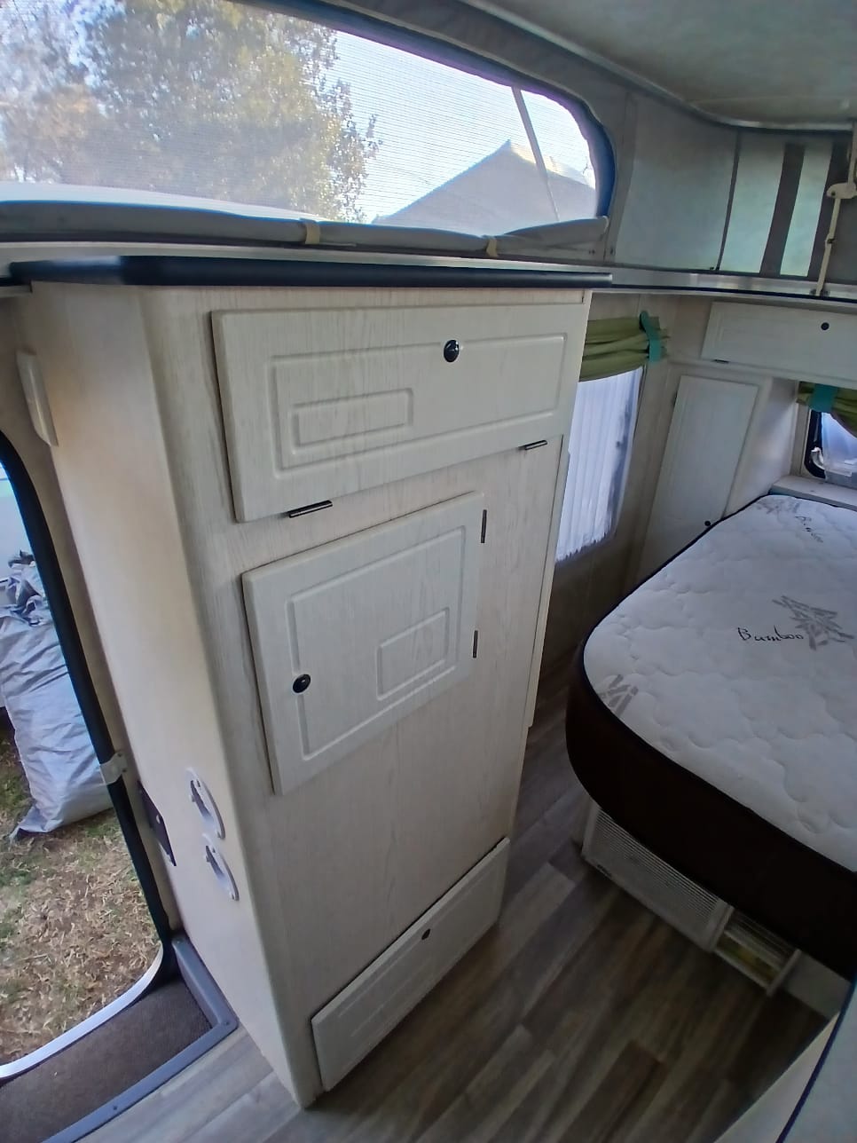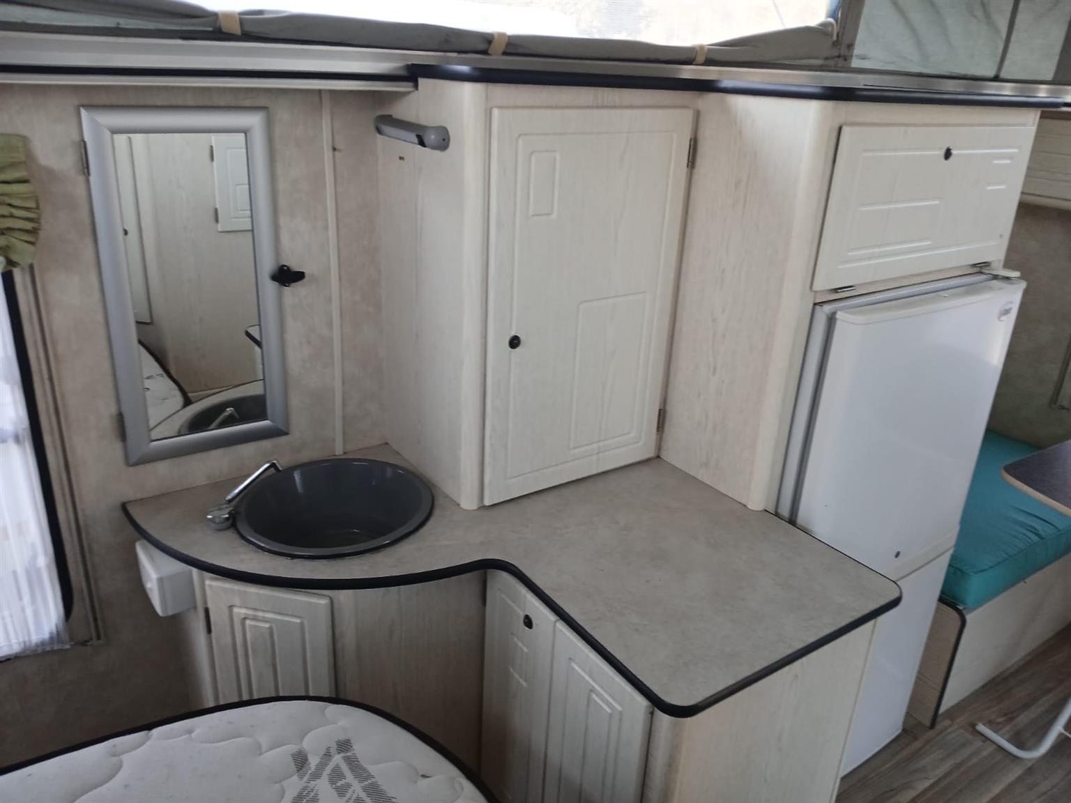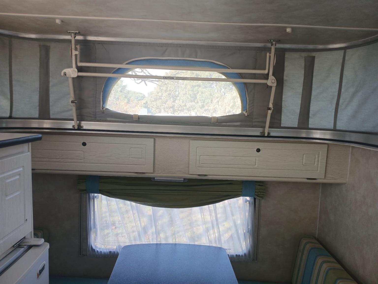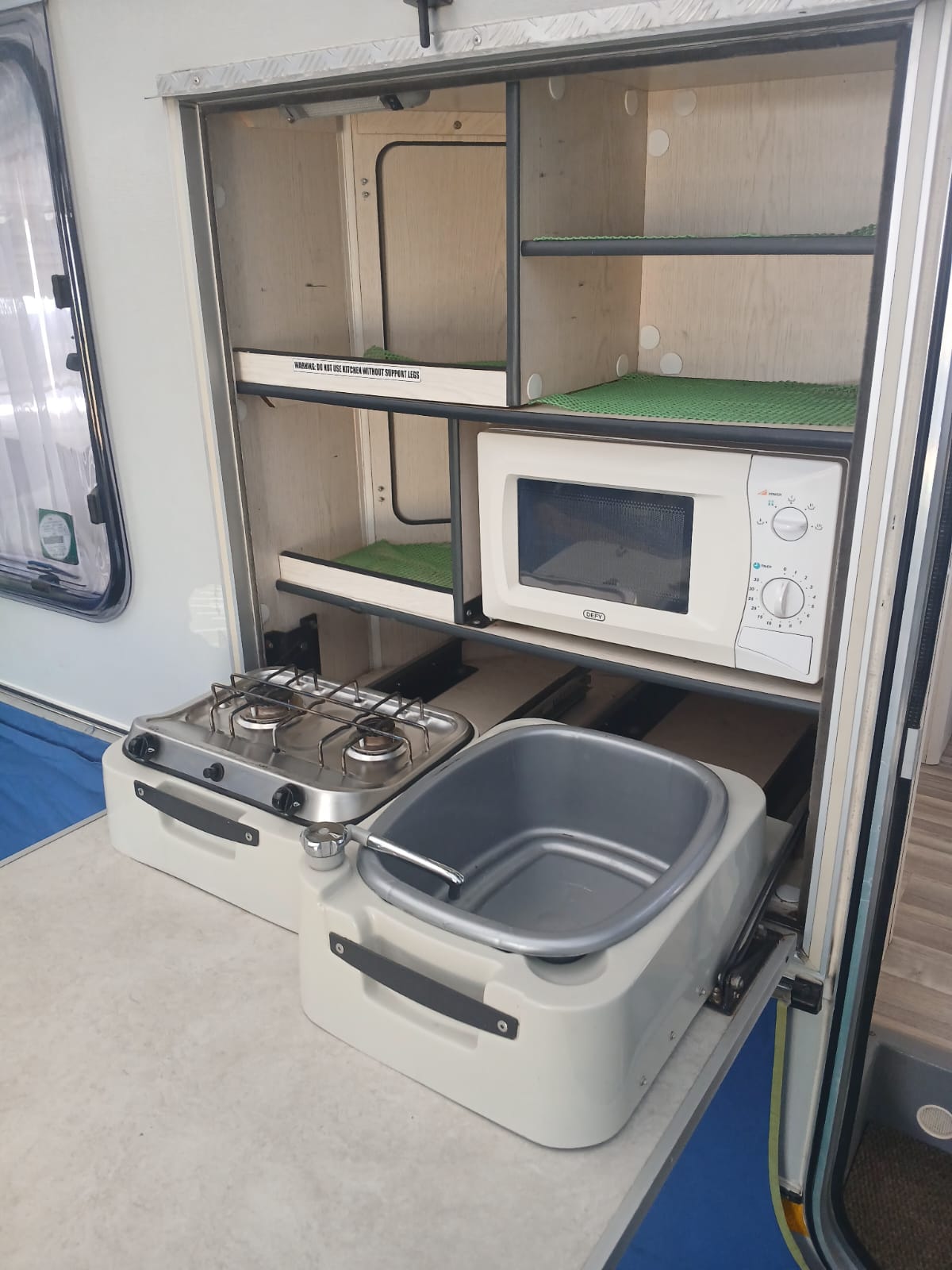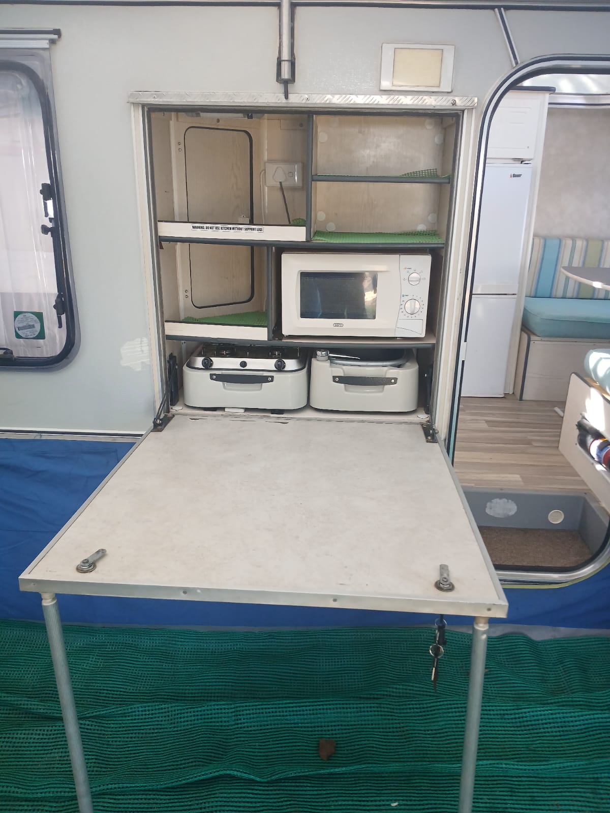 Caravan in excellent condition ready to camp with aircon fitted as well as brand new tires just fitted. The caravan has got a complete out side kitchen consisting of a large drop-down working surface fitted in outside kitchen you have got your two plate gas stove as well as a washup basin with microwave installed and packing space for all cutlery and crockery. The caravan comes complete with a full tent in excellent condition with ground sheets and all necessary poles,ropes and pegs for the tent work. Inside the caravan you have got a practical layout LED lights fitted all round as well as a large double door fridge freezer the caravan has got a double Island bed in the front as well as a additional 3/4 bed in the rear that can convert into a dining area with collapsible table. All standard accessories included paperwork on hand #FINANCE AVL #TRADE INS WELCOME *072*775*3523*