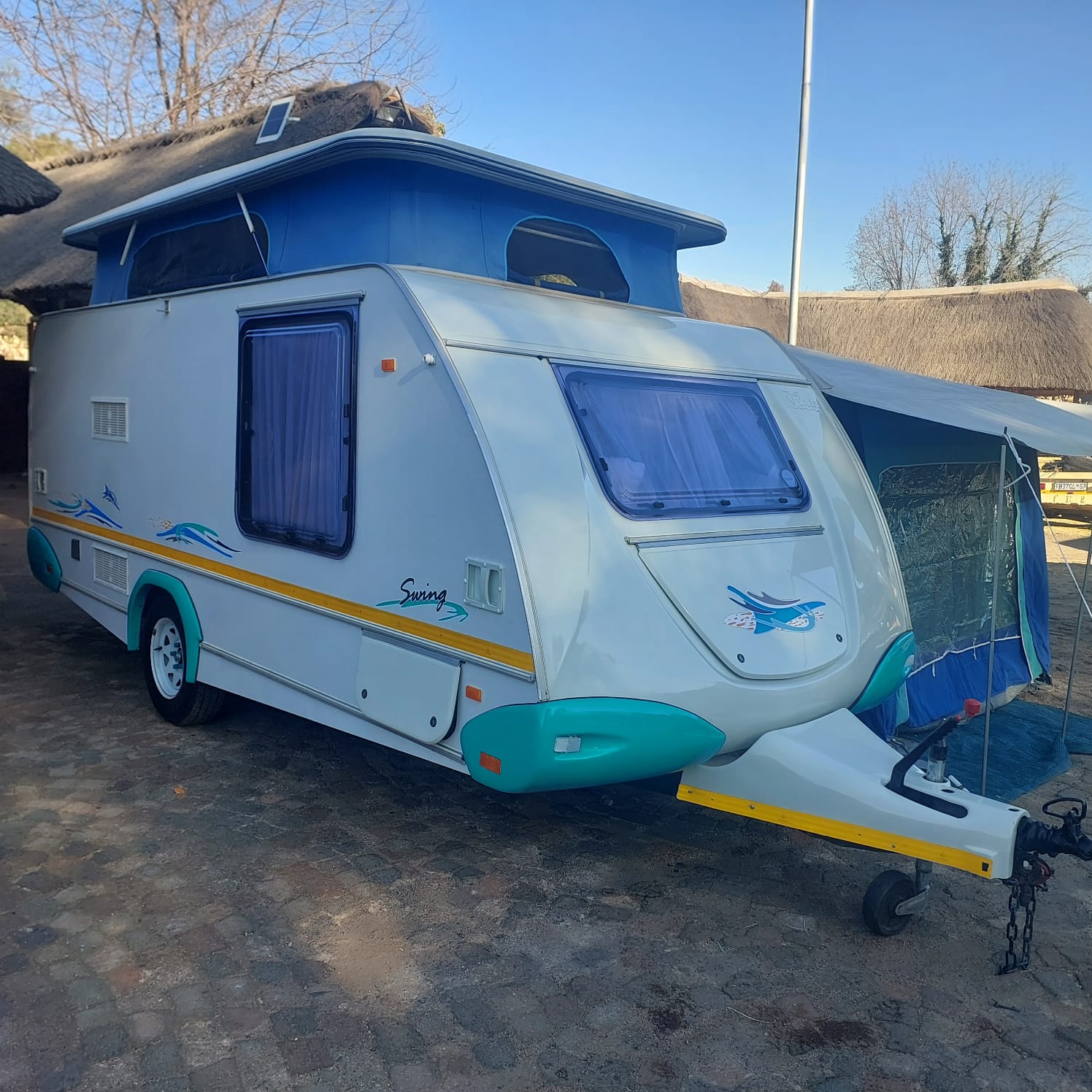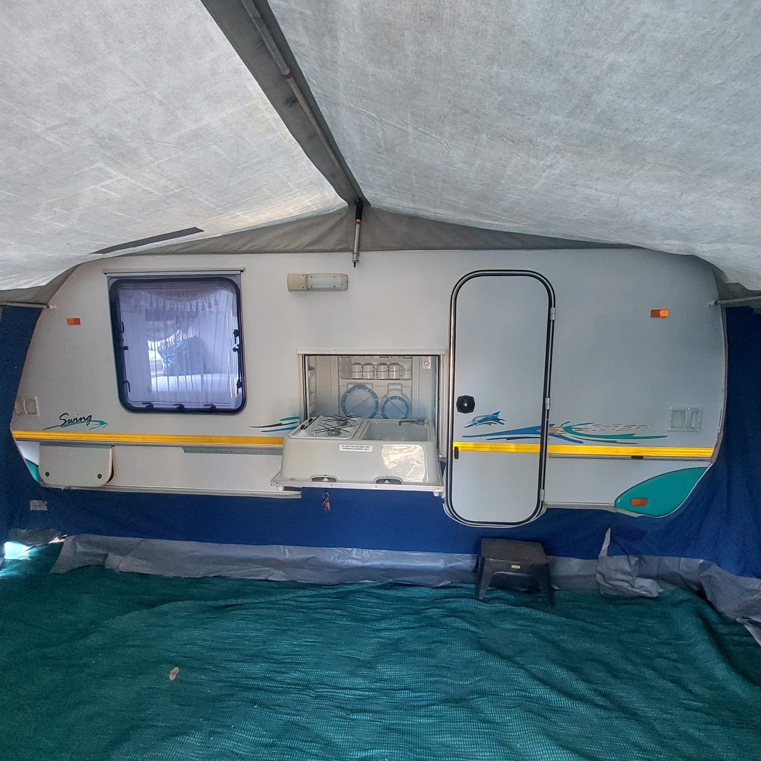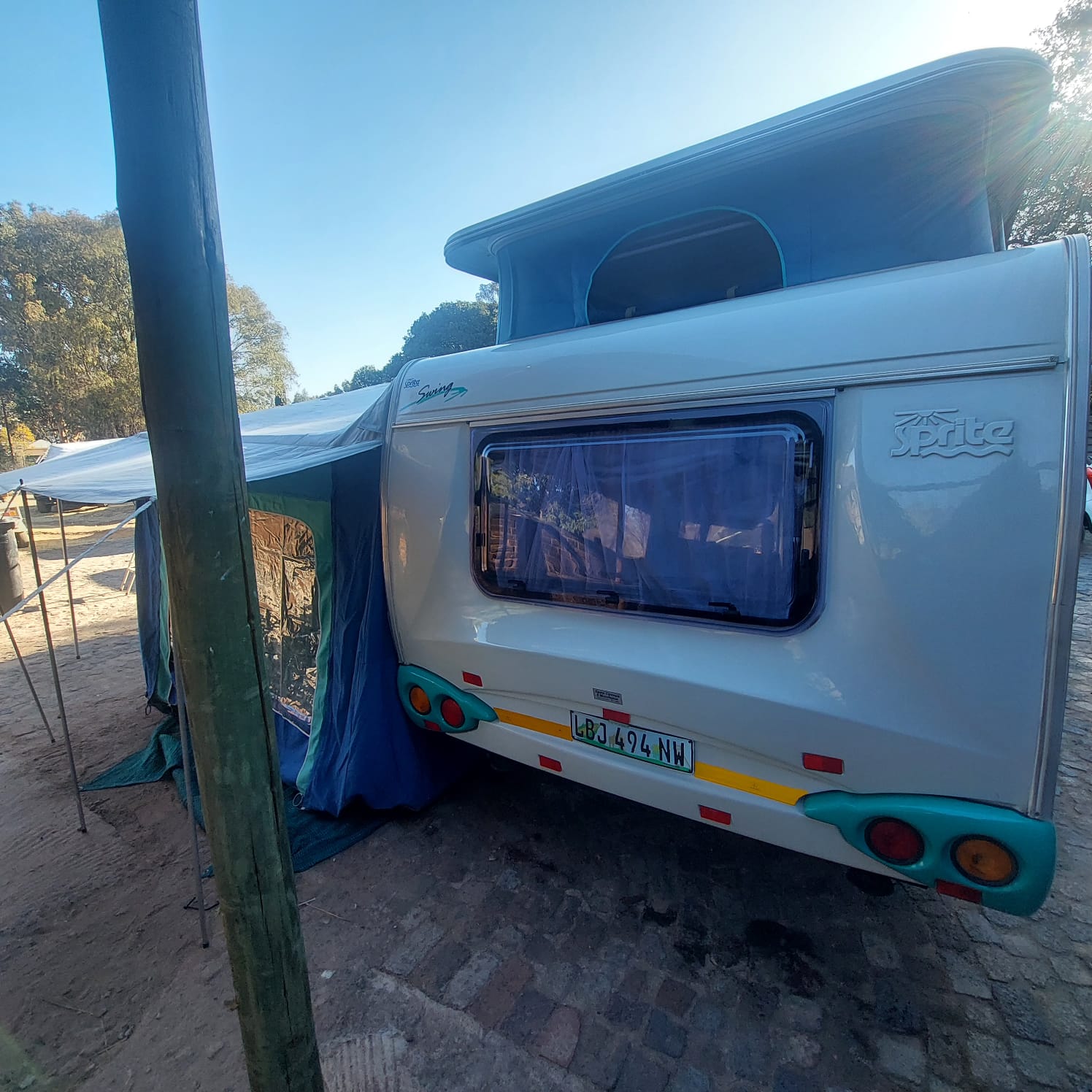 2003 Sprite swing caravan in very good condition ready for holiday. Included is a full tent with ground sheet and all necessary accessories for the tentwork. The caravan has got a complete outside kitchen with fold out gas stove and wash up Basin with storage compartments for all your crockery and cutlery. Inside the caravan has got a electric fridge fitted with freezer compartments as well as a microwave. The caravan has got a Island bed in the front as well as a additional 3/4 bed in the rear that can convert into a dining area with collapsible table. The caravan has just been professionally resealed and serviced. All standard accessories included such as spare wheel gas bottle water bottle with water pump Jack handles electric extension cord and fire extinguisher license fully up to date contact me anytime to arrange viewing in benoni *072*775*3523*