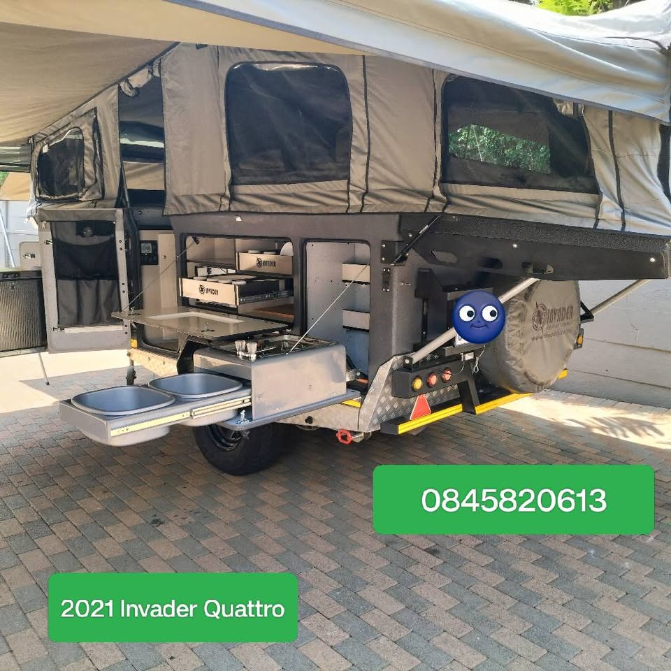 🏆🏆Immaculate as good as new , 2021 Invader Quattro 4 sleep with additional extras. Luxury combined with rugged off Road capabilities. One owner and garaged since new .... 💥Features Galvanized ladder-type chassis Auto Reverse coupler with 2000kg rated run-in brake capacity 10 Blade leaf spring system 1800kg rated solid axle 3 x 15” 6 stud rims with 245 x R15 all terrain tyres 250mm Removable heavy-duty jockey wheel Removable lifting leg 2 x Quick release rear support struts 100 litre chassis mounted water tank 2 x Pole boxes Full original crockery set for 6 Storage cover included 💥Body Seamless & flexible construction from laminated fibre glass 2 x Jerry can brackets Large nose box with, side doors National Luna Dual control Fridge / Freezer on slider 1 x Gas bottle bracket 1 x 3kg Gas bottle Slide out stove unit with 2 plate stainless steel gas hob Kitchen unit with microwave & Teflon working surface Slide out double basin 💥Electrical 220 volt AC 3 point all weather exterior multi-plug Volt 3 point plug with 2 point – Euro socket – Interior 5 x 12 volt DC sockets – 3 Exterior & 2 Interior 1 x 105 amp deep cycle battery 30amp PBE battery charging system Solar charge regulator-solar ready Pressure pump system 💥Interior Hot foil wrapped marine ply cupboards fitted with vanity basin Standard double & ¾ bed – high density foam mattresses Industrial wood finished flooring 2x Seating areas with a removable portable toilet (Porta Potti included) 💥Tent Canvas tent – windows with mosquito netting & all-weather cover Side Awnings and zip on rear and front awning Full side panels to close of tent with additional awning. Incorporated silver reflective sheeting on roof and tent. All documentation in order . Finance, Registration and countrywide delivery available. Call or whatsup Pieter on 0845820613view more for appointment to view in Centurion. After hours also available. 🏆🏆Only R 352900.....