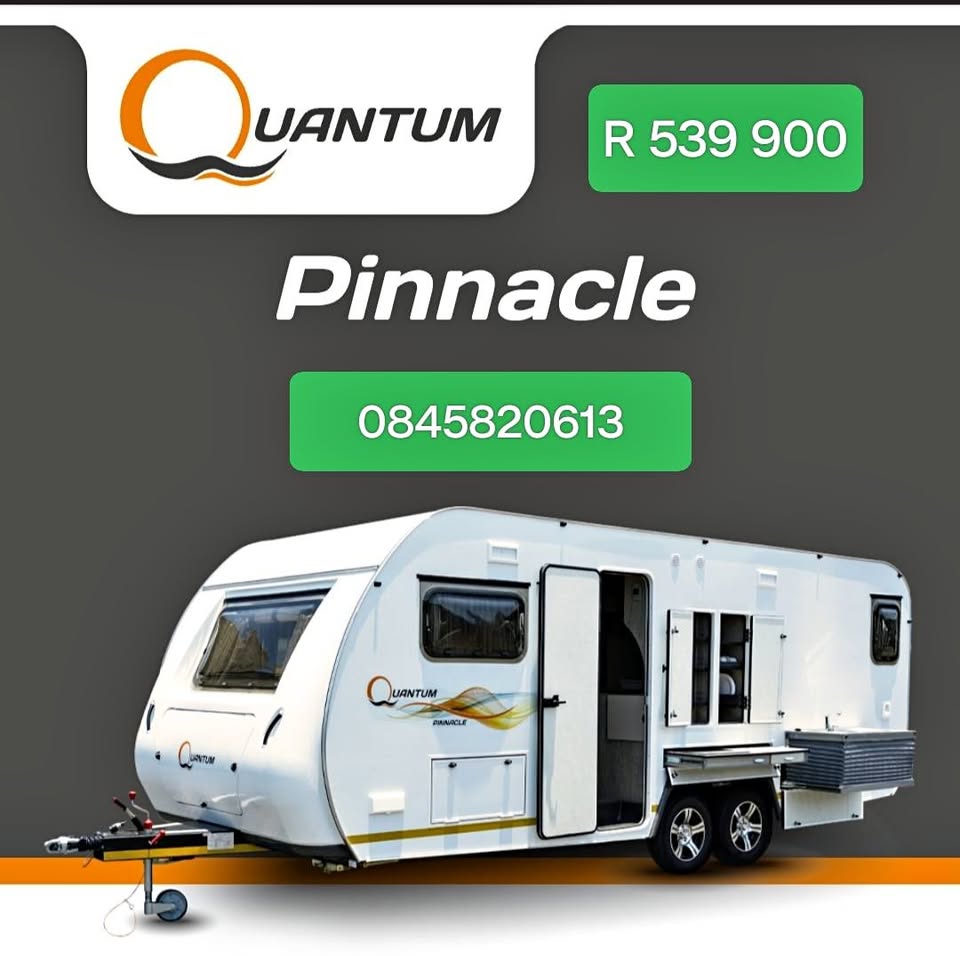 🏆🏆 2022 Quantum Pinnacle Immaculate with a lot of extras for a dream holiday. The 2/3 berth Quantum Pinnacle Caravan offers the ultimate in space and luxury. Some of it’s unique features includes a 4 seat dinette and spacious full bathroom. This double axle caravan is fitted with the most modern accessories and offers premium packing space. Easy towing makes this caravan perfect for your weekends away or for long stay holidays. 💥Features / Additions : Travel Blanket Reverse camera / Screen for car Extractor Fan in Bathroom Movers - Remotely Airconditioner LED lights in cupboards Awning in sidepocket on caravan installed 💥Specifications : Overall Length (mm): 7360 Lisencing Mass (Tara) (kg): 1640 Loading Capacity (kg): 310 Axles: 2 Tyres: 185/14C Fridge Freezer (L): 223 Microwave Oven: Standard Hot Water Geyser: Electric Cassette Toilet: Yes Bathroom / Water Closet: Bathroom Shower: Yes Water Tank (L): 50 Self Filling Water system: Yes Pull out Stove: Double Induction Pull out Basin: Standard Outdoor Kitchen: Yes Island Bed: Yes Dinnette: Yes Roof Vent: 2 Interior Lights: 12V LED Exterior Light: 12V LED Outside Multi Plug: 2 220V Power Pack, Battery: Standard This sought after hotel on wheels caravan is to be view on appointment only. Please call or whatsup . 💥All documentation in order. 💥Registration , Finance and countrywide delivery (Add costs) available. Please call or whatsup Pieter for viewing by appointment or for more information on . 💥Only R 539 900.......