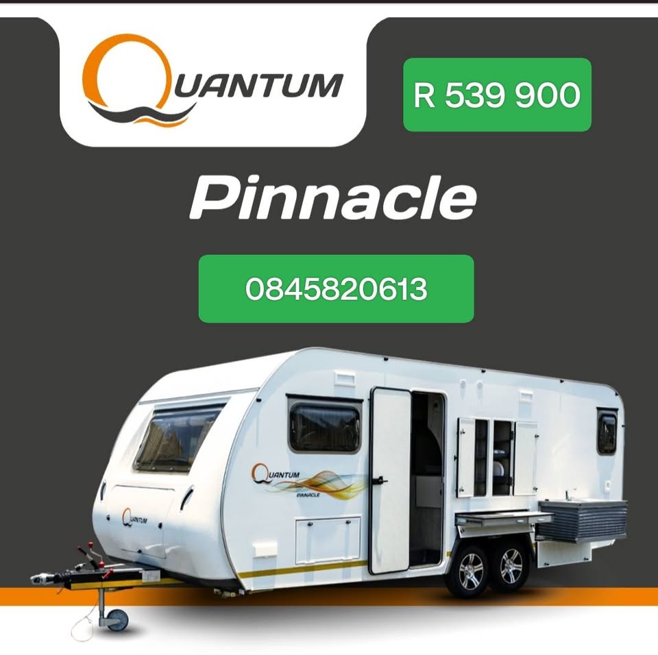🏆🏆 2022 Quantum Pinnacle Immaculate with a lot of extras for a dream holiday. The 2/3 berth Quantum Pinnacle Caravan offers the ultimate in space and luxury. Some of it’s unique features includes a 4 seat dinette and spacious full bathroom. This double axle caravan is fitted with the most modern accessories and offers premium packing space. Easy towing makes this caravan perfect for your weekends away or for long stay holidays. 💥Features / Additions : Travel Blanket Reverse camera / Screen for car Extractor Fan in Bathroom Movers - Remotely Airconditioner LED lights in cupboards Awning in sidepocket on caravan installed 💥Specifications : Overall Length (mm): 7360 Lisencing Mass (Tara) (kg): 1640 Loading Capacity (kg): 310 Axles: 2 Tyres: 185/14C Fridge Freezer (L): 223 Microwave Oven: Standard Hot Water Geyser: Electric Cassette Toilet: Yes Bathroom / Water Closet: Bathroom Shower: Yes Water Tank (L): 50 Self Filling Water system: Yes Pull out Stove: Double Induction Pull out Basin: Standard Outdoor Kitchen: Yes Island Bed: Yes Dinnette: Yes Roof Vent: 2 Interior Lights: 12V LED Exterior Light: 12V LED Outside Multi Plug: 2 220V Power Pack, Battery: Standard This sought after hotel on wheels caravan is to be view on appointment only. Please call or whatsup 0845820613view more. 💥All documentation in order. 💥Registration , Finance and countrywide delivery (Add costs) available. Please call or whatsup Pieter for viewing by appointment or for more information on 0845820613view more. 💥Only R 539 900.......