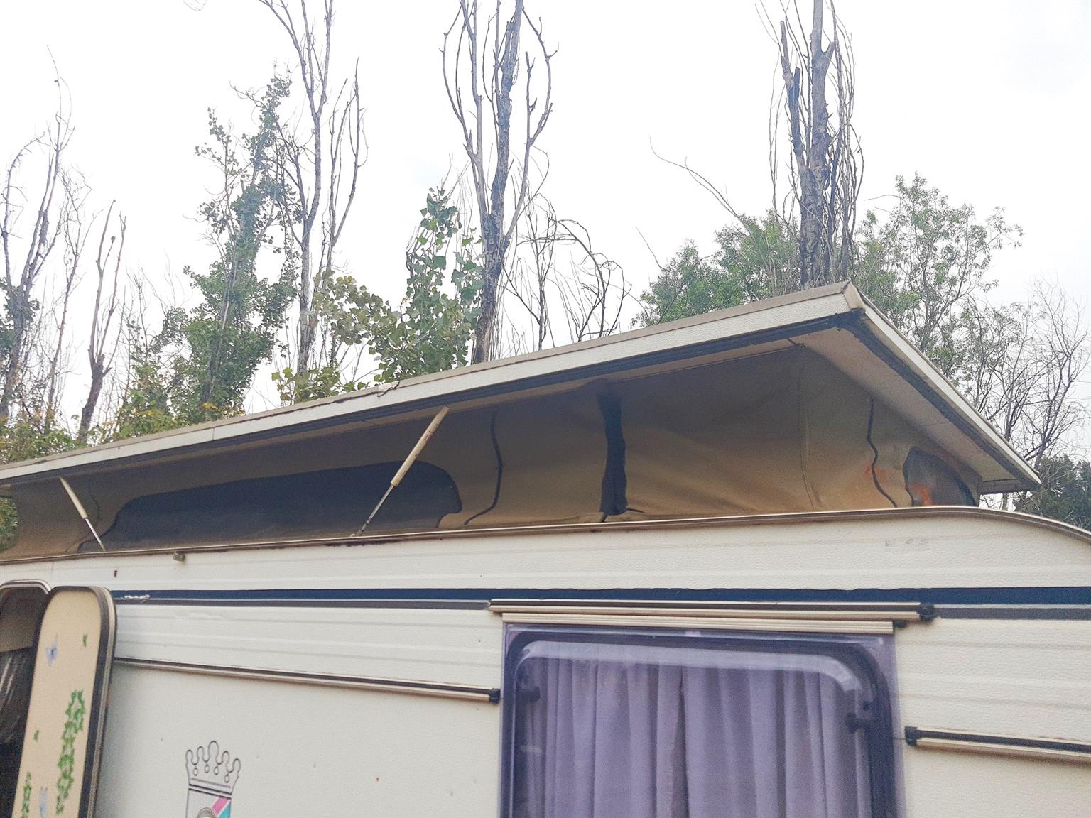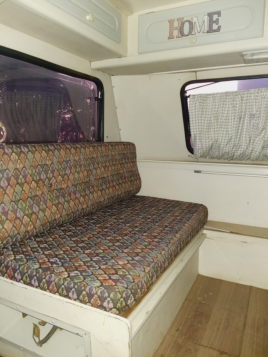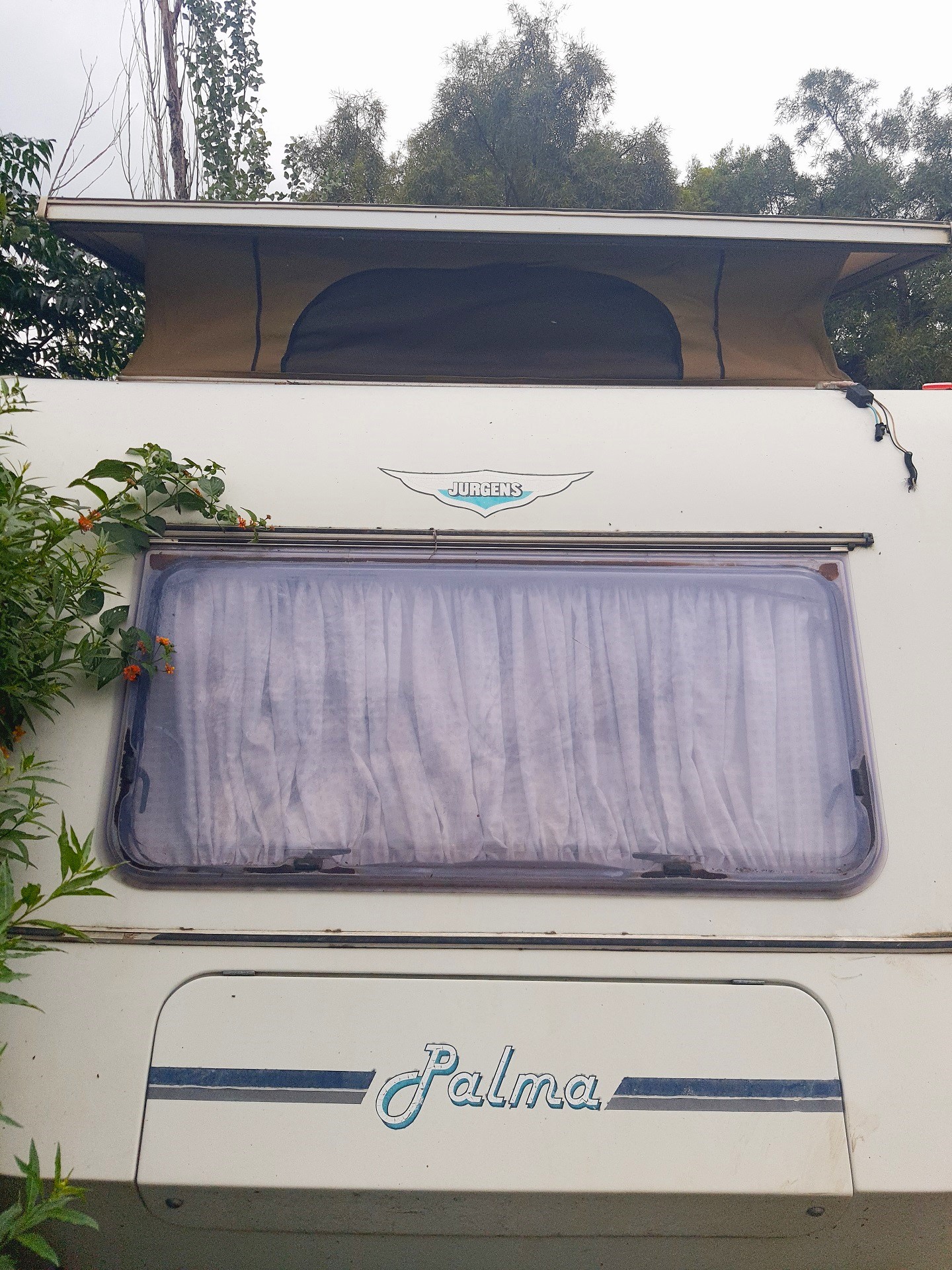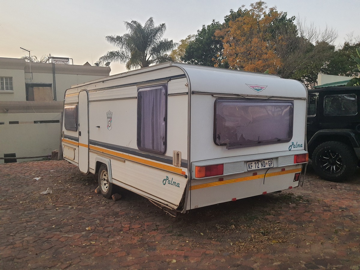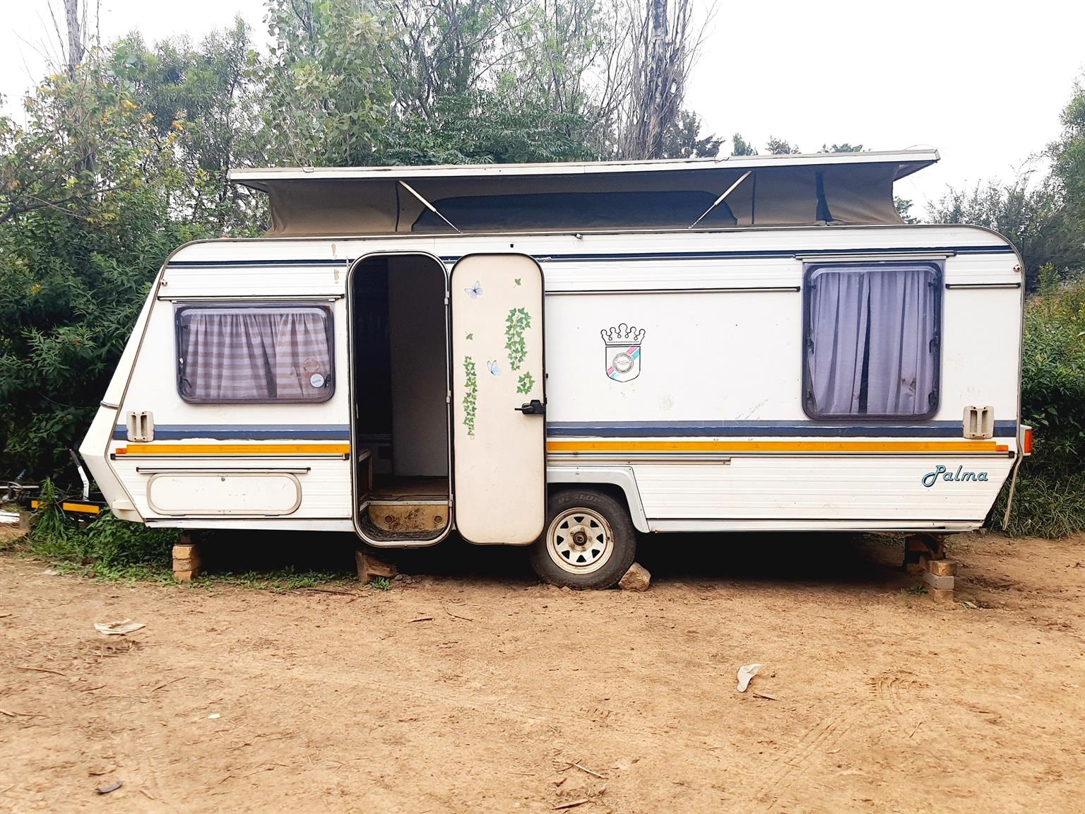 A rough gem in need of a cut and a polish. 1994 model Jurgens Palma caravan. Papers in order. Licenced. Features include: Indoor toilet, shower & hand basin, gas & electric water heaters, inverter for use with battery, water tank with pump, base & mattress, seat cushions, curtains, fridge compartment, full tent with extension, tent poles, as new tyres, spare wheel, wheel spanner, wheel lock bolts, as new handbrake, plus some spares & parts e.g. table pole & hinges, light fittings, kitchen sink. Kitchen & bedroom areas were partially stripped when caravan was used as a granny flat attached to a house. Issues include missing nose wheel & chassis damage at the rear end & bottom rear body panel damage both due to ground contact, loose lateral body sections & loose internal fittings due to resultant body sway, slight roof moisture damage, no kitchen. Needs a good carpenter to restore.