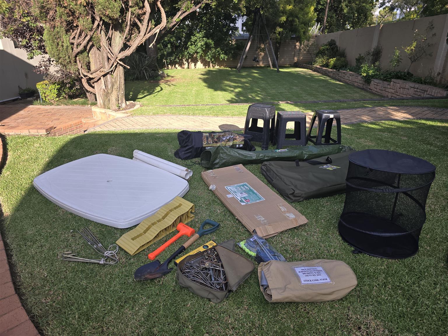 Many Camping extras like table, shelves, camp master 6 shelves cupboard, dish washing station etc.