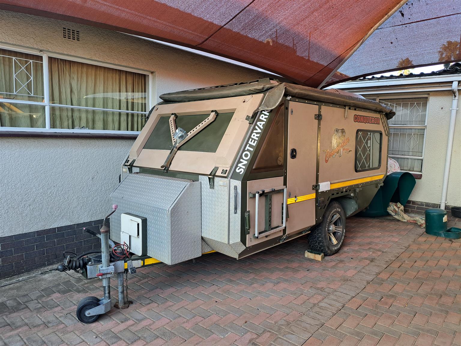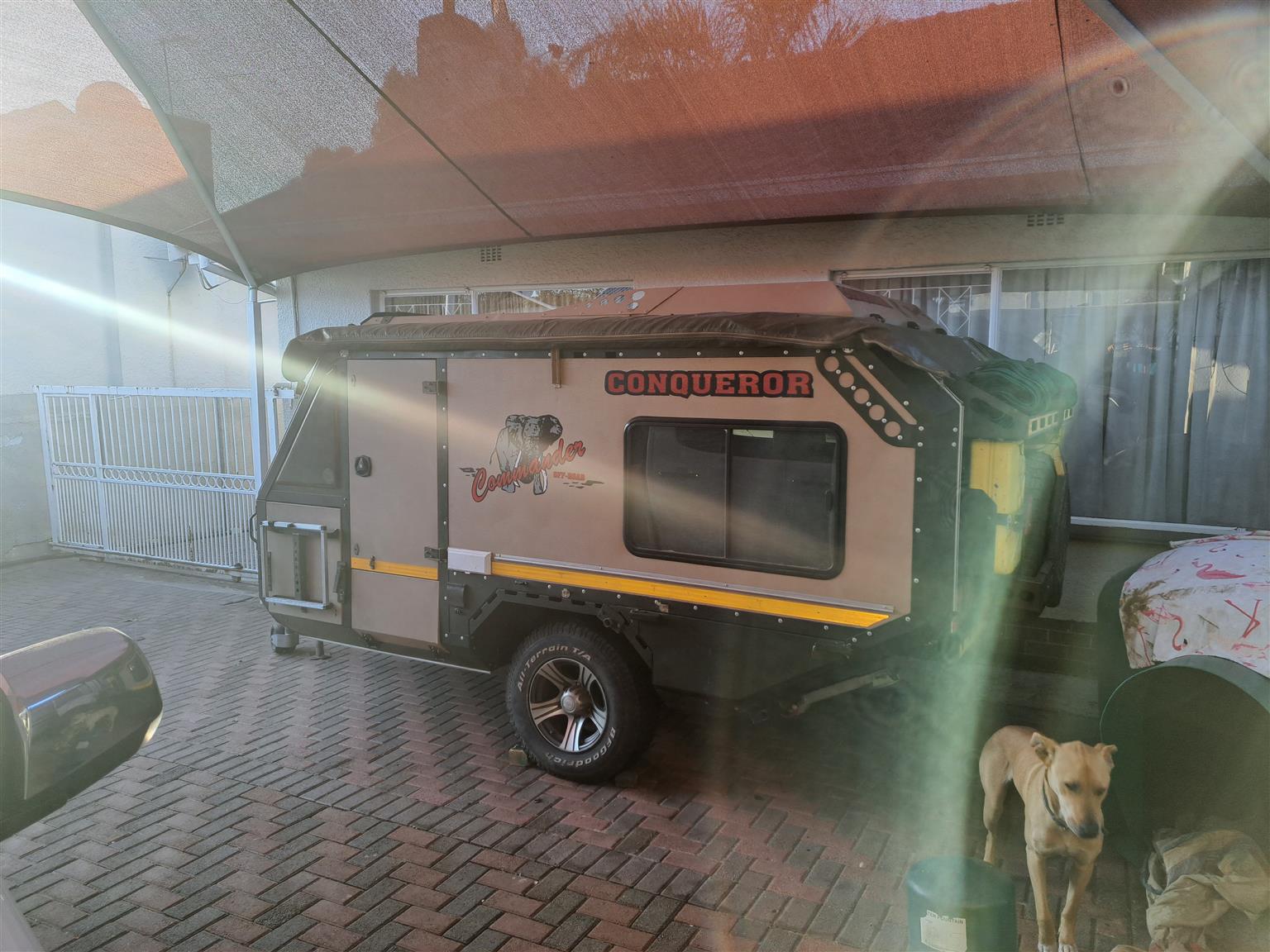 Conqueror Commander 2007 model, Standard rally and all sides and the skirt, Standard Shower tent on other side with all sides, Geyser 220v and Gas, cutlery included, 90l National Luna fridge, Jacks at the back to stabilize left to right and level caravan, tyres still very good, spare tyre not used and on caravan, conqueror grill on tyre at the back, tents all in good condition and the matrasses also still very well looked after. Have plug in also to charge caravan with car conversion. 2 x jerry cans.