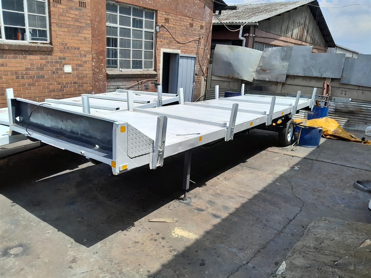 Bakkie trailer for sale. Has 5th wheel fitted. Single axle. Can carry 2.5 tons when hitched. Ideal for small steel deliveries. See it also on https://machinemarketsa.co.za/wp/category/trailers/