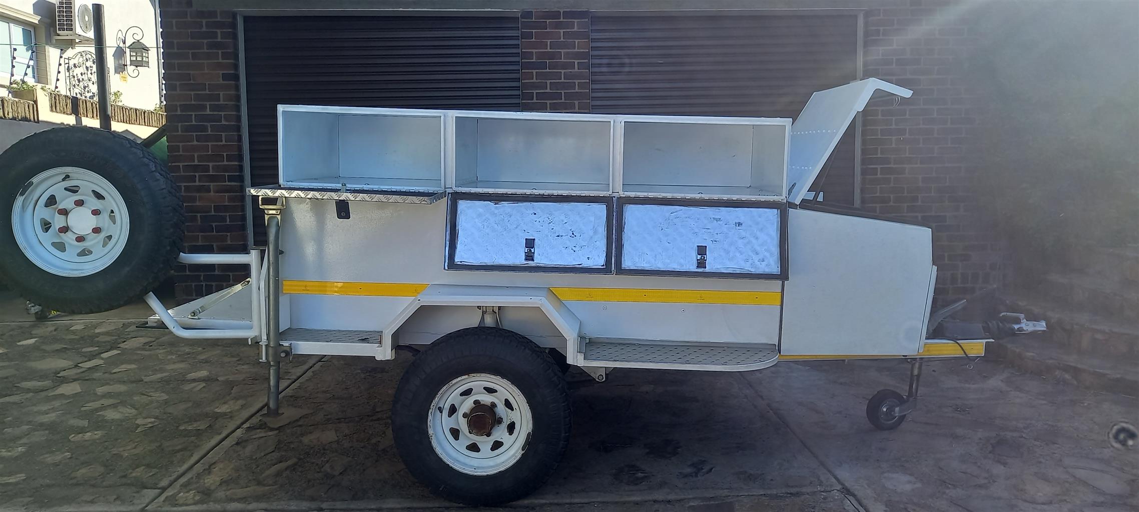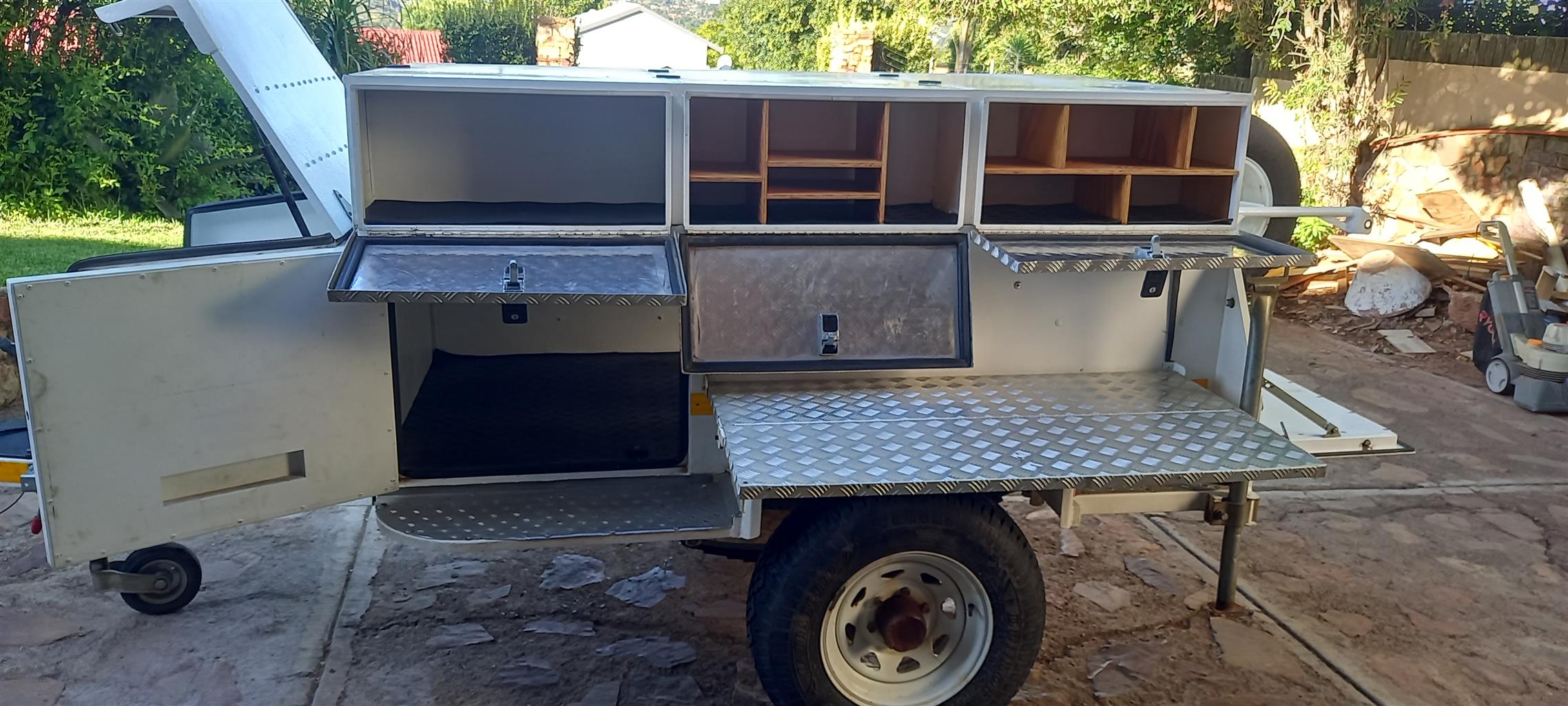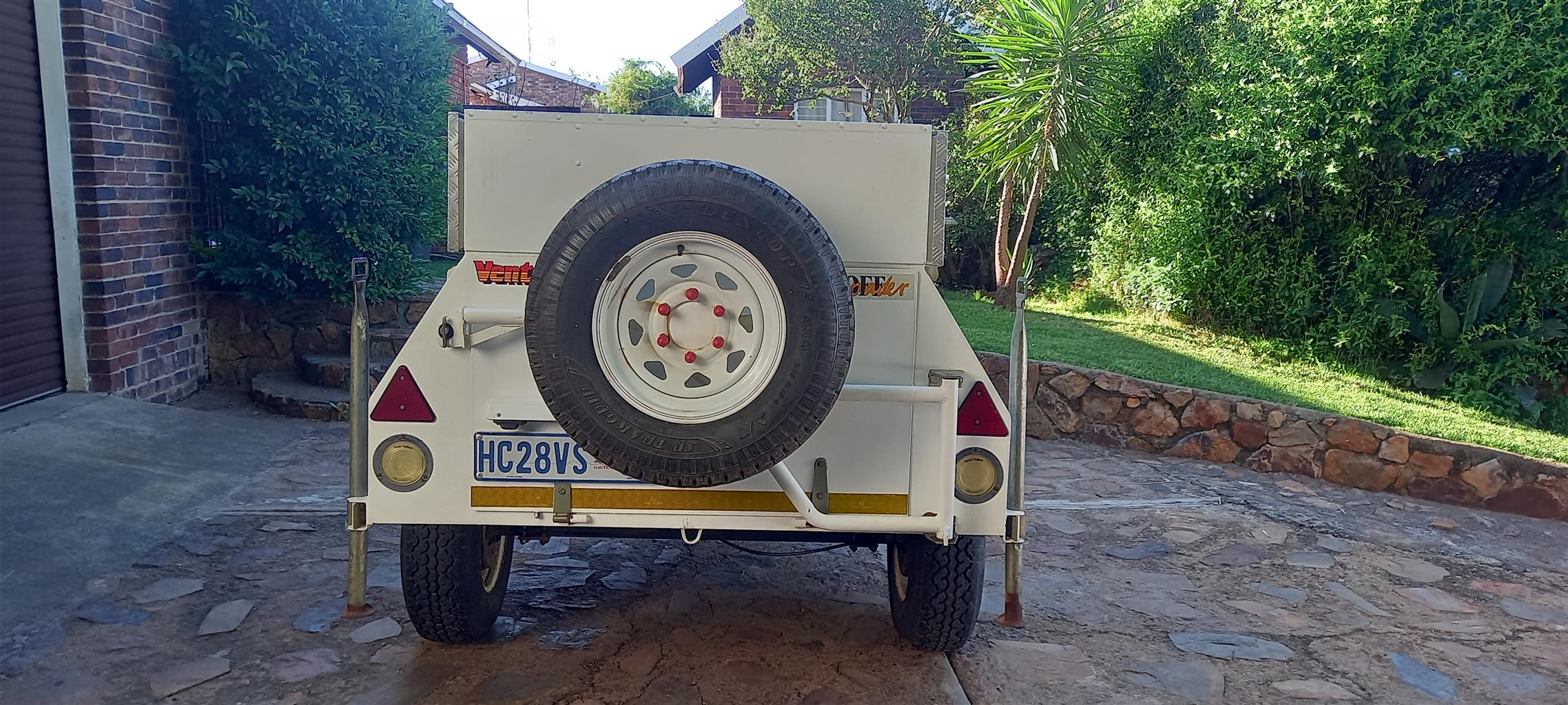 Venter off roader trailer. Box added for camping. Heavy duty axle, tyres in good condition. Lid, nosecone toolbox and side jerry can holders included.