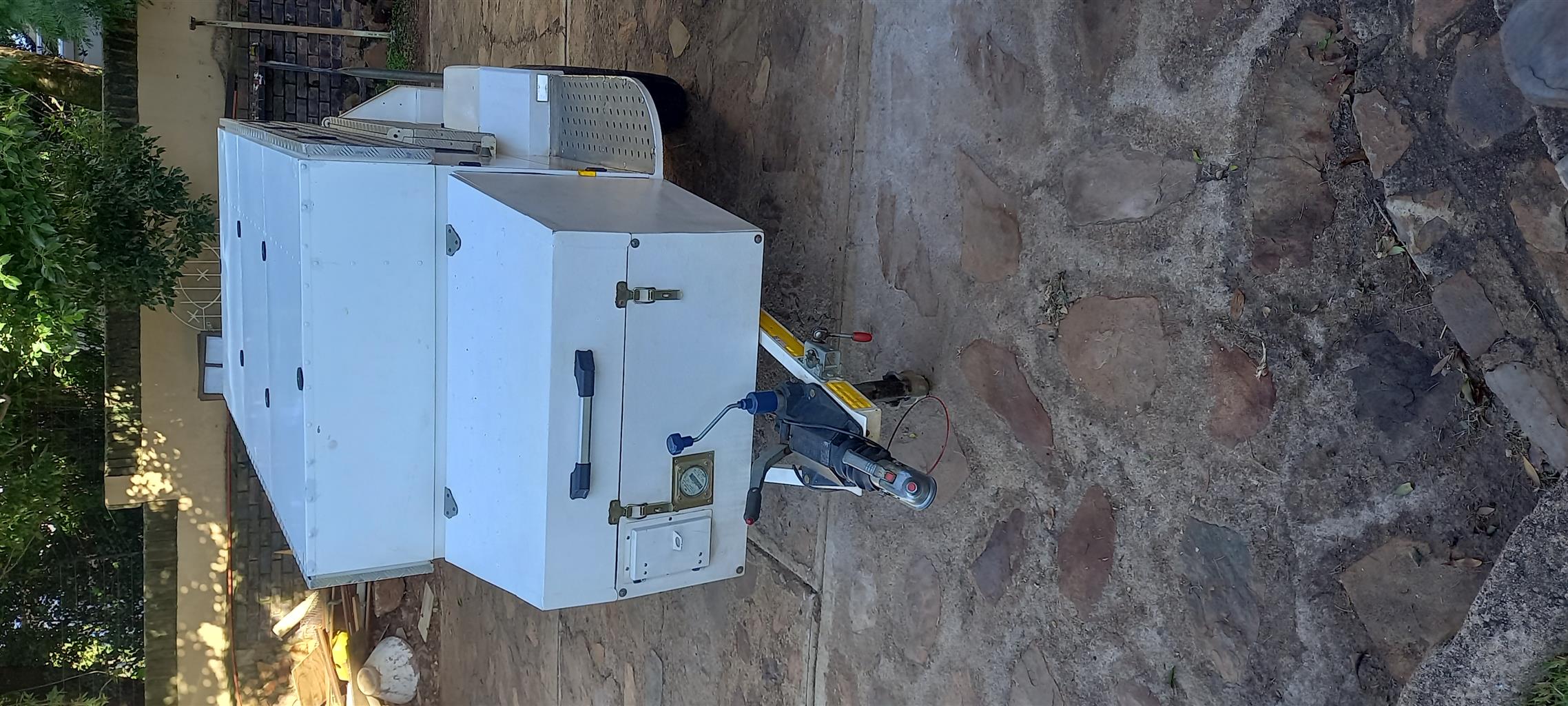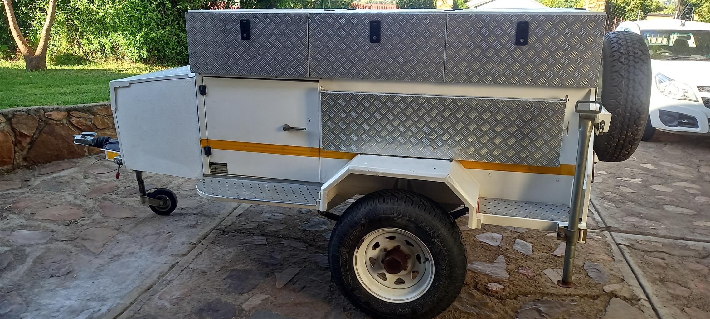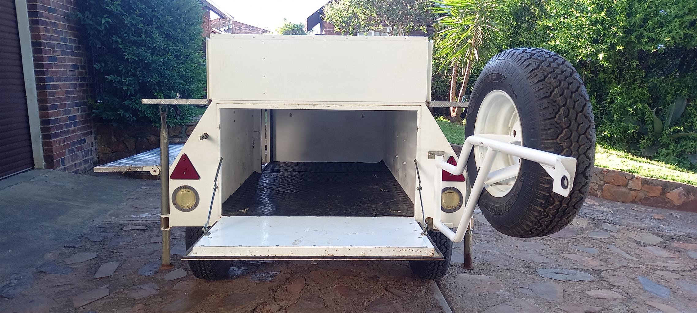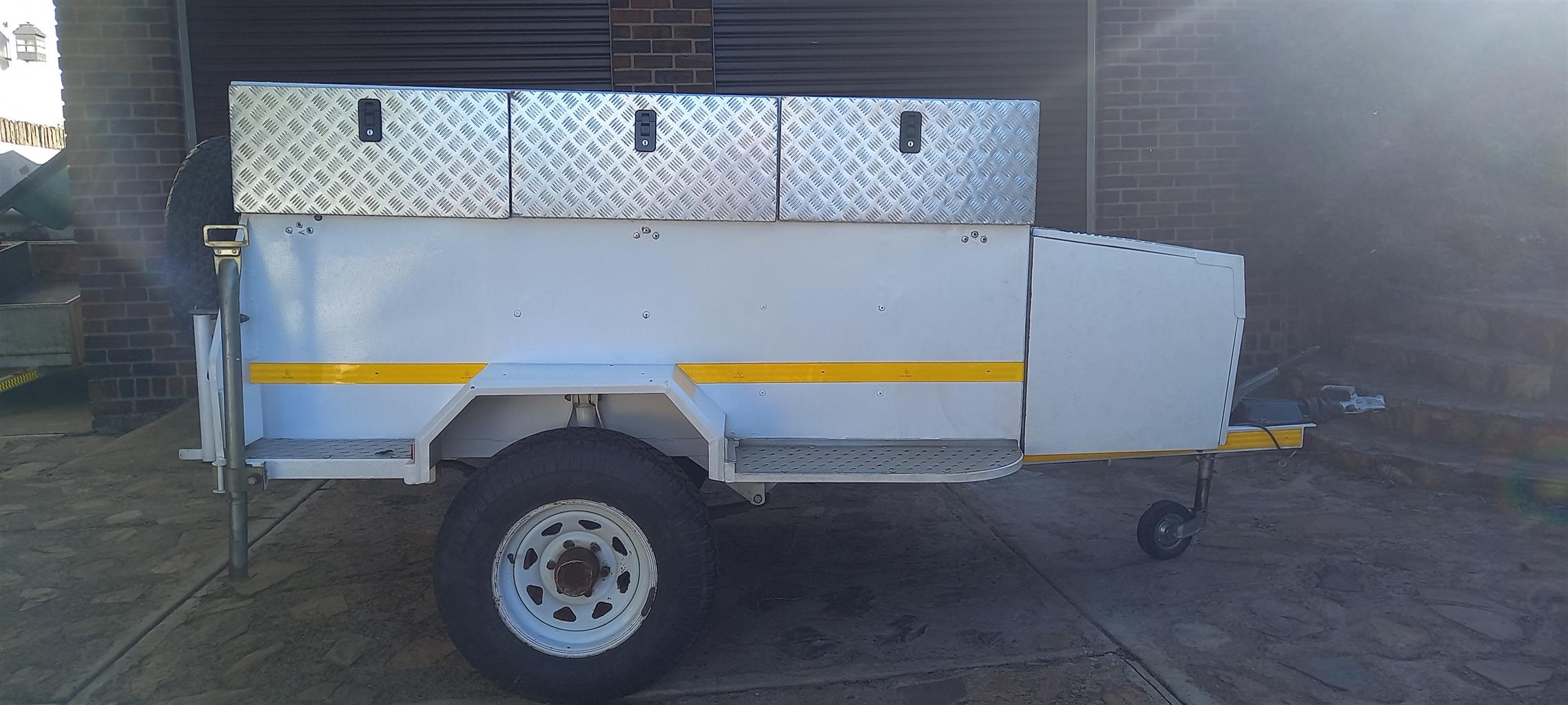 Venter off roader trailer. Box added for camping. Heavy duty axle, tyres in good condition. Lid, nosecone toolbox and side jerry can holders included.