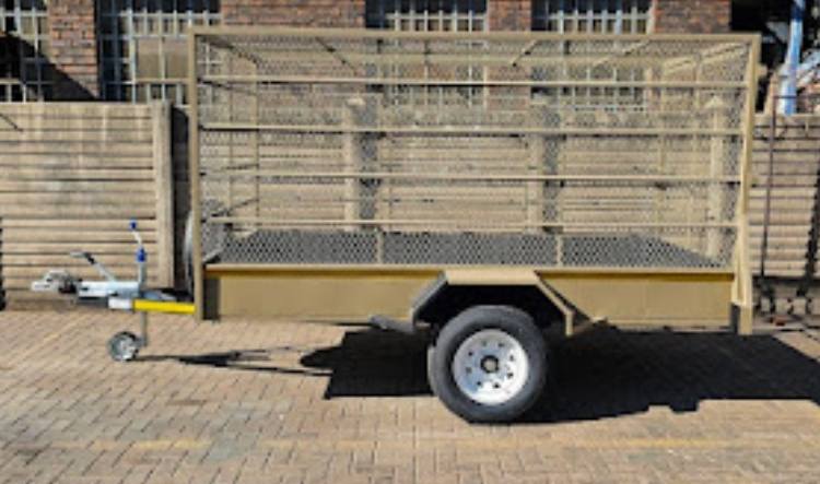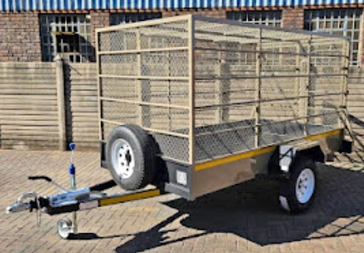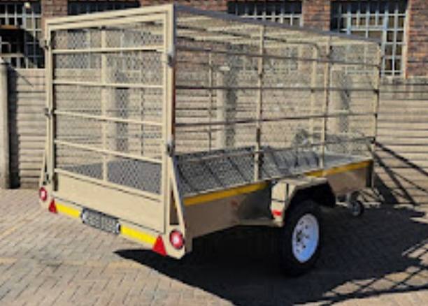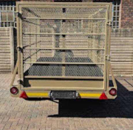 3 Meter X 1.5 Meter X 1.5 Meter Swing gate on back. ⁃ Spare wheel bracket mount on front of a-frame. LED Truck Lamp Sealed Lights - Fully covered in Mesh + Top Suspension - Single Axle Braked 45mm SQ (PCD 5/114) - 8 Blade Leaf Springs 27" (940kg) 14" 195C Rim & Tyres (Pro-white) 2 Ton Braked Coupler Extras Jockey wheel 48mm + Clamp = R999.99 ⁃ Spare wheel 13" Rim & Tyre = R1199.99