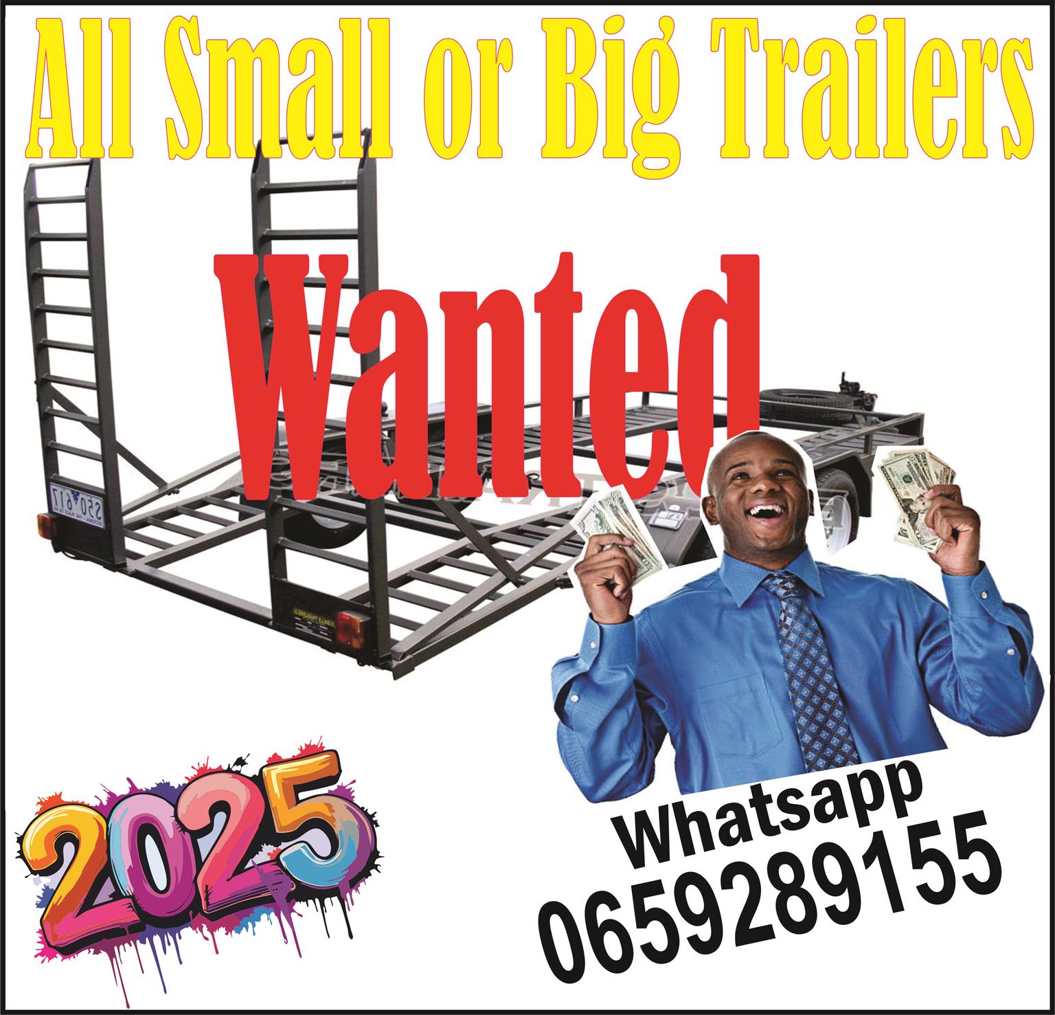 Trailers Wanted now, we will buy big or even small trailers, we also dont have a problem to buy from you no matter where you are in s.a. it is easy, JUST send us a Picture and Info via whatsapp and we will get back to you with an offer, easy propses and we buy all movable assets you dont want. . 0659289155view more
