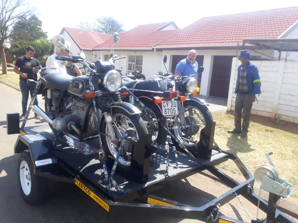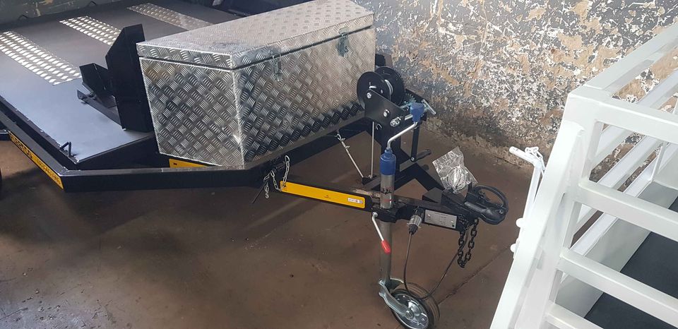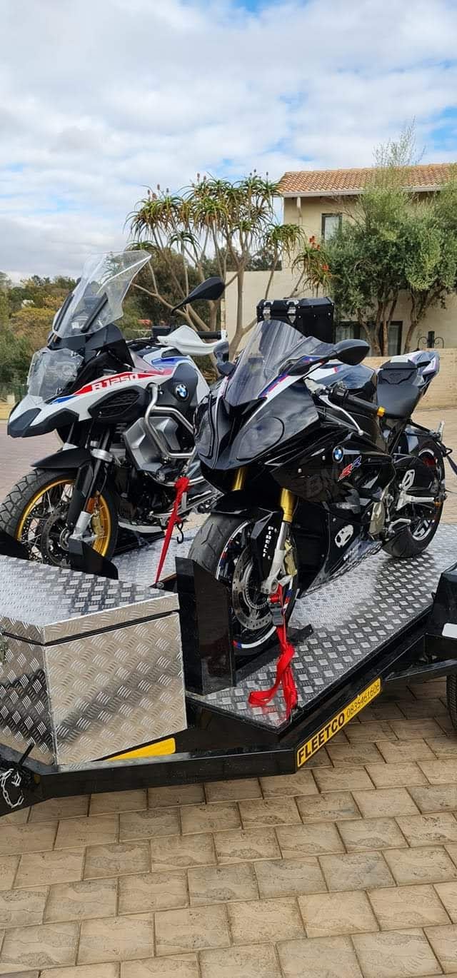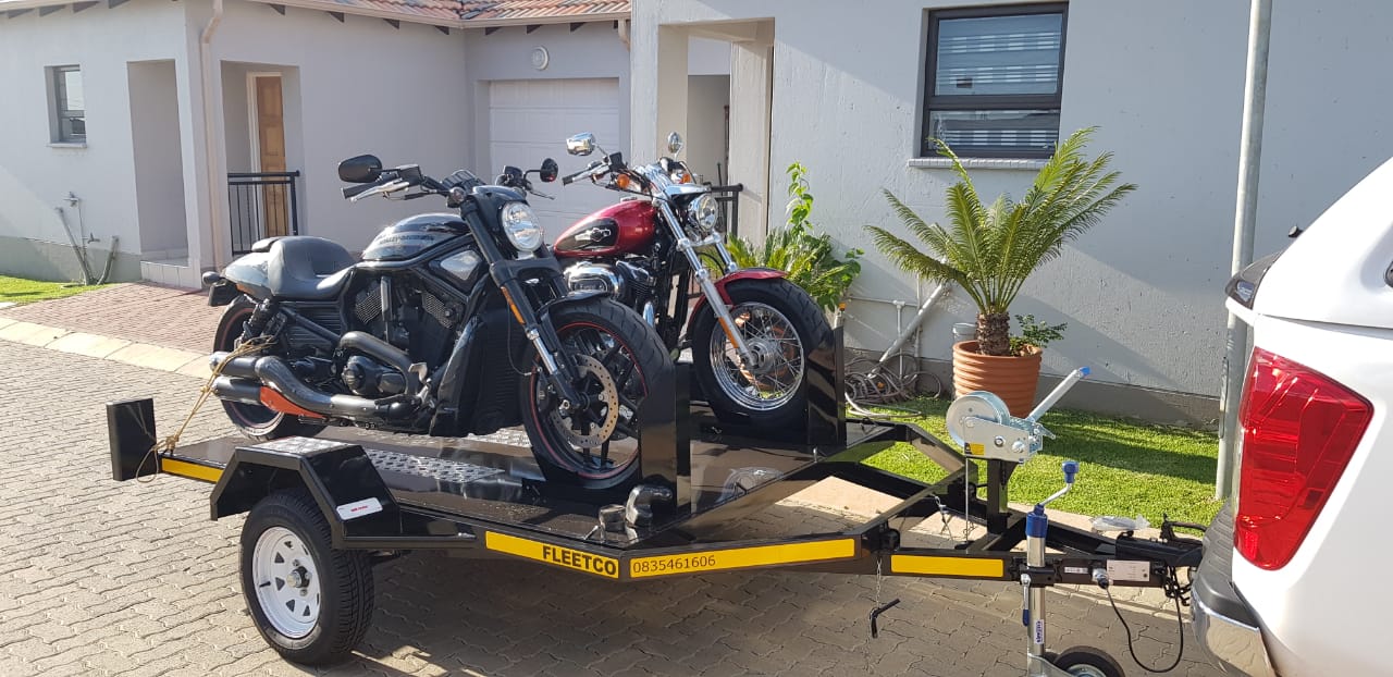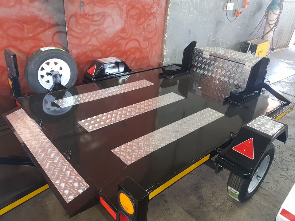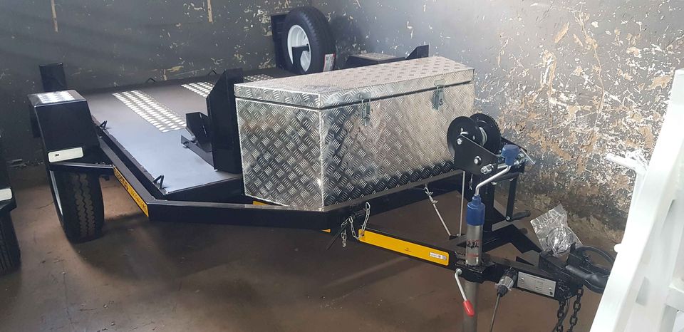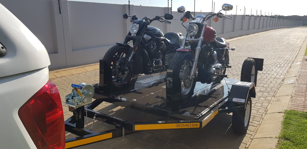 2 Bike easy loader swivel Bike Trailer with Aluminium Box. Price included Papers, Vat, ID Dot, Spare wheel 13" tyres, 2x wheel catchers, Jockey wheel, Aluminium box, Universal coupler lock, LED lights, Strong waterproof license disk holder. We are SABS registered and approved.