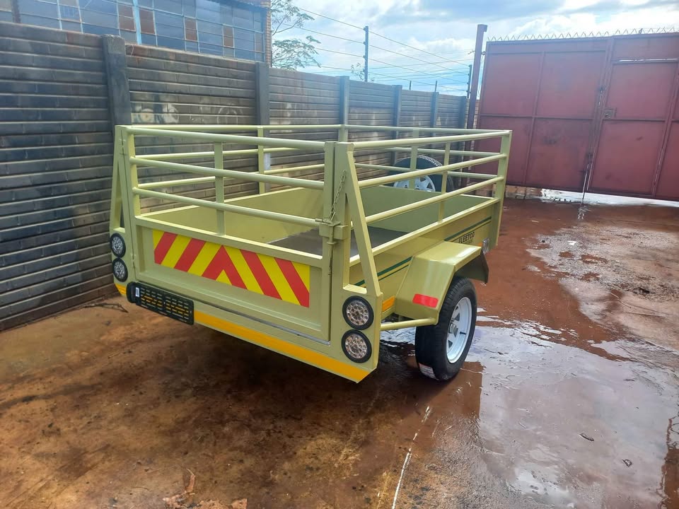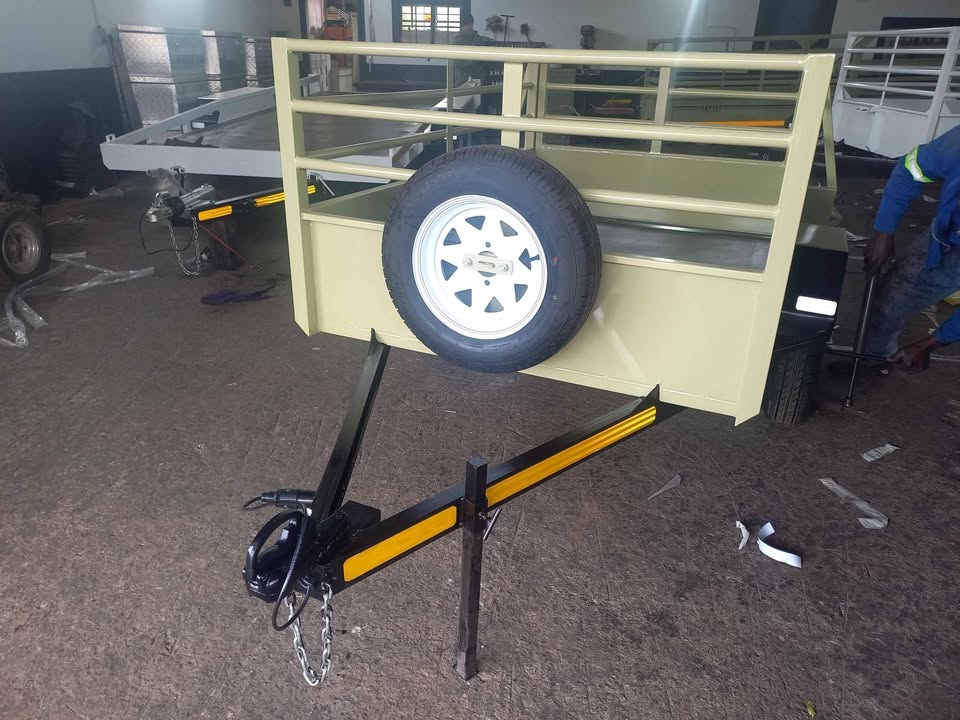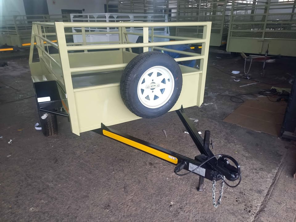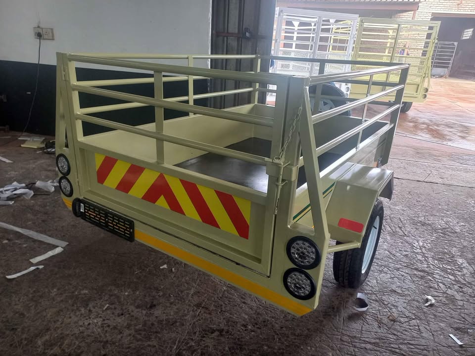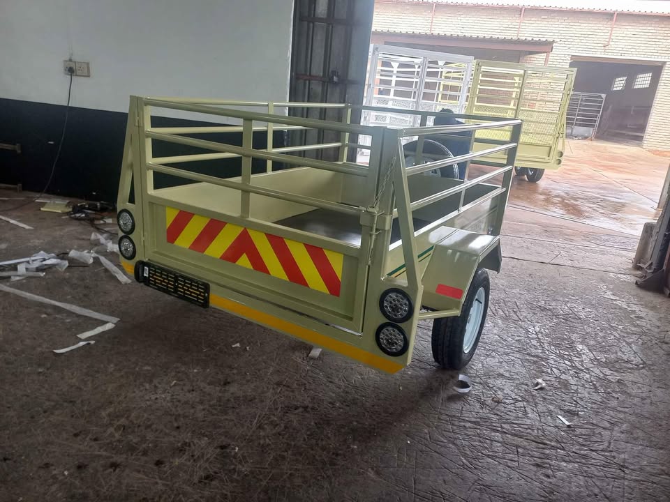 Contact Jeunice Grobler to place an order 068*332*3203 or 072*390*7107 whatsapp is welcome for the pin location, factory located in Westonaria 2m x 1.280m x 850 Single axle unbraked (900kg) 13" wheels Spare wheel Universal lock Standing pole LED lights Steel disc holder Canvas available at an extra cost Color option of white or khaki All our prices includes vat, ID dot, papers and already through the test