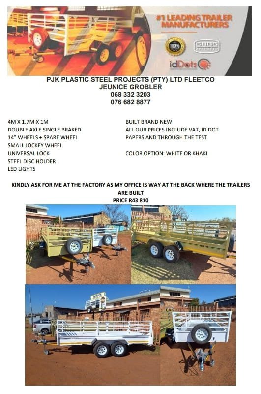 JEUNICE GROBLER 068 332 3203view more 076 682 8877view more 4M X 1.7M X 1M BUILT BRAND NEW DOUBLE AXLE SINGLE BRAKED ALL OUR PRICES INCLUDE VAT, ID DOT 14” WHEELS + SPARE WHEEL PAPERS AND THROUGH THE TEST SMALL JOCKEY WHEEL UNIVERSAL LOCK COLOR OPTION: WHITE OR KHAKI STEEL DISC HOLDER LED LIGHTS KINDLY ASK FOR ME AT THE FACTORY AS MY OFFICE IS WAY AT THE BACK WHERE THE TRAILERS ARE BUILT PRICE R43 810