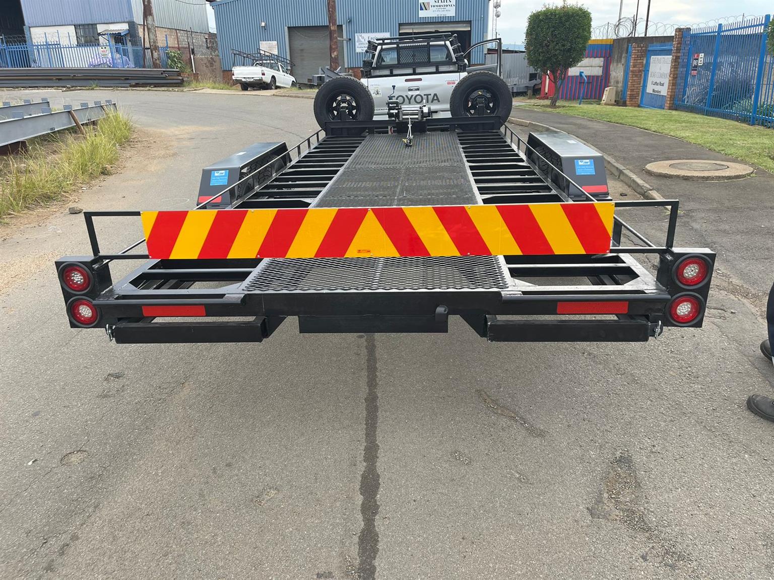 Our very latest 5.5m x 2.2m wide heavy heavy duty car / landcruiser / taxi / tractor / bobcat / TLB trailer with twin 2.5 Ton axles, 4 x 16" wheels, 4 x 2.5 Ton springs, 3.5 Ton coupler, 60mm jockey wheel, 8000LB Runva winch and 105 Amp-hr battery in metal lockup box, slide out ramps at the rear, double LED rear lights and pull out chevron plate, all paperwork provided. Delivery can be arranged nationwide.