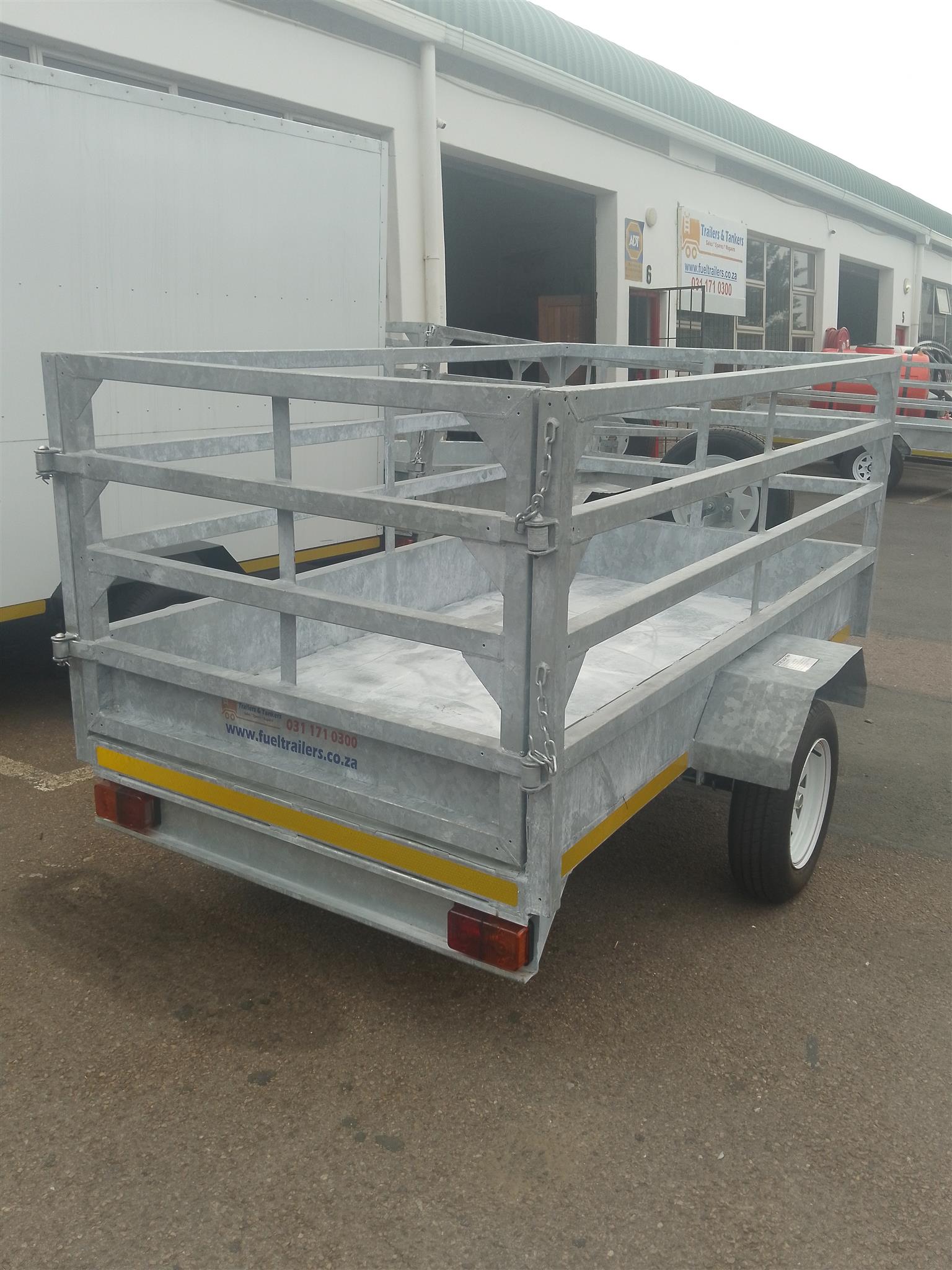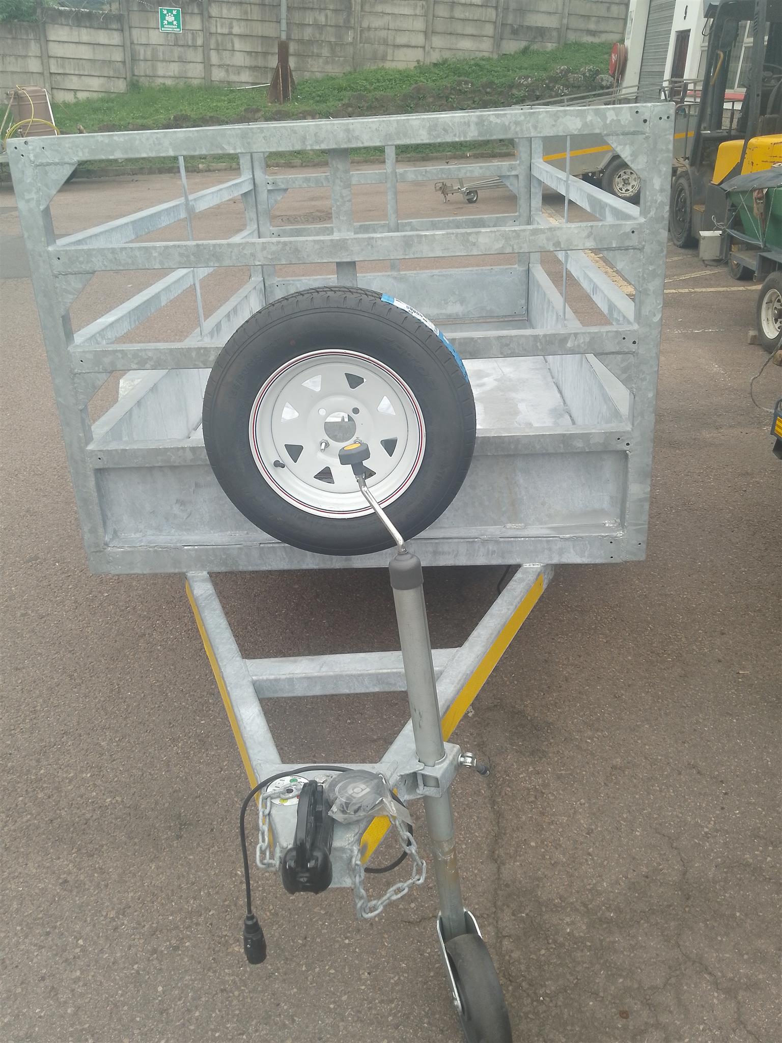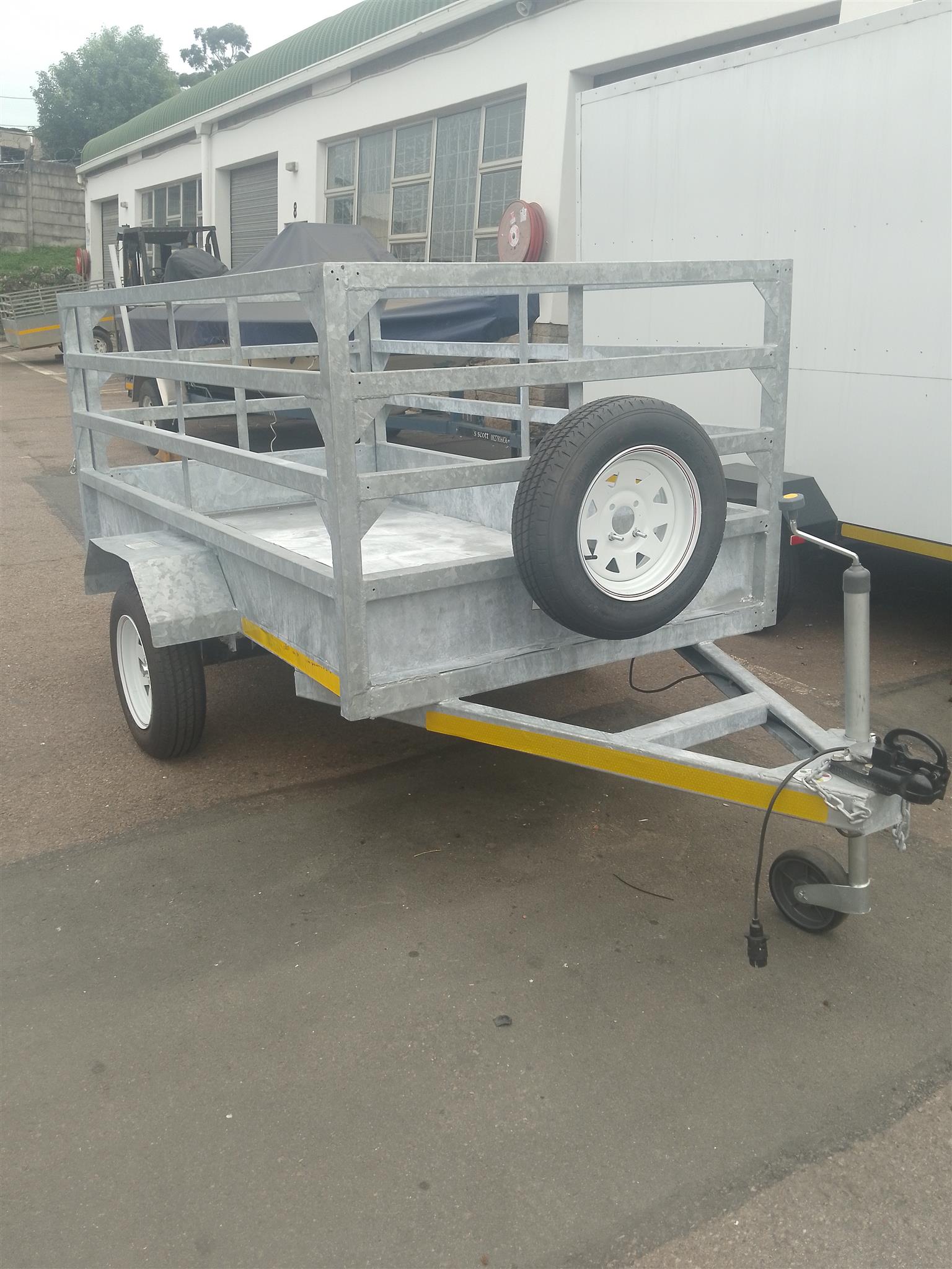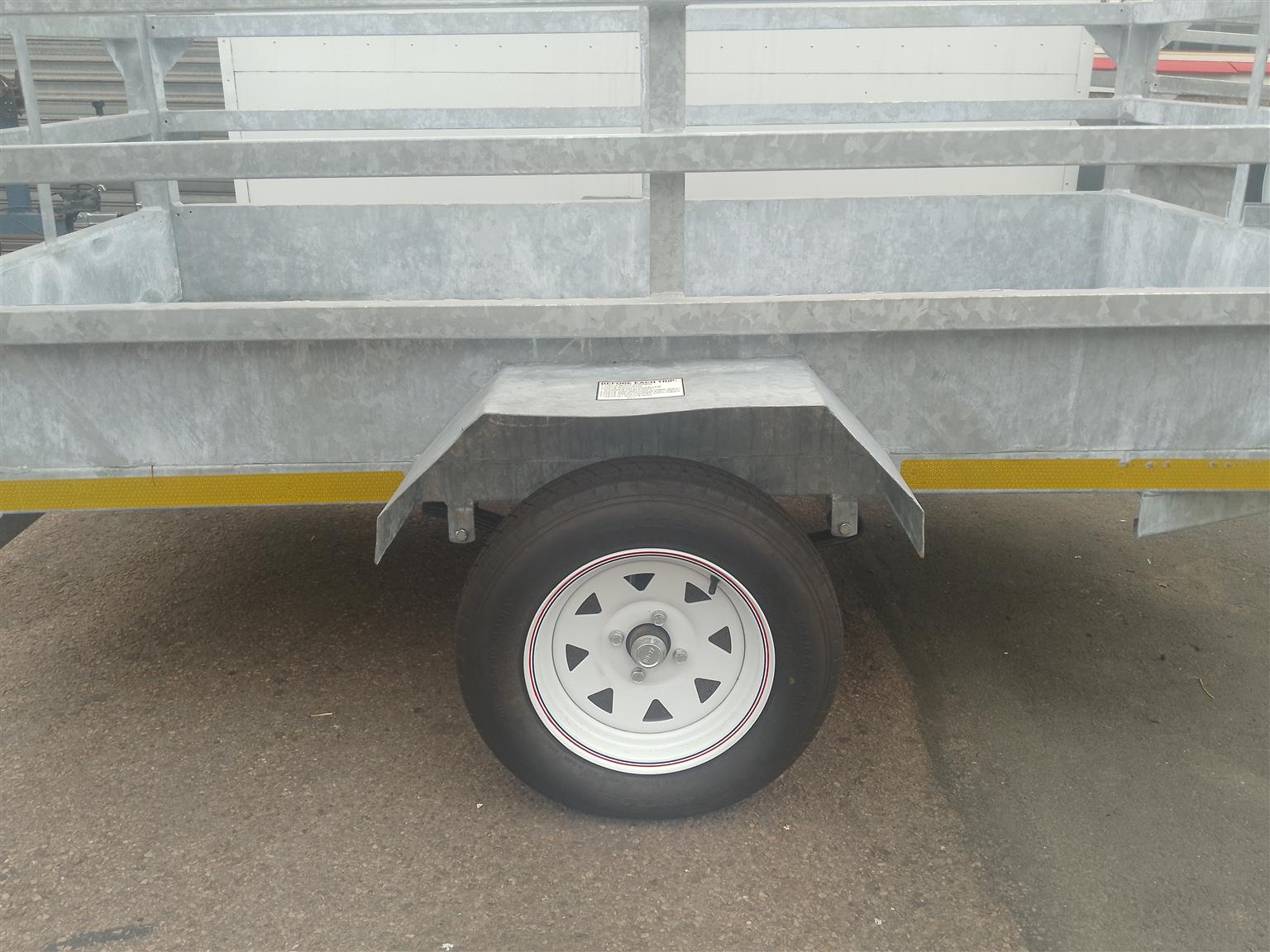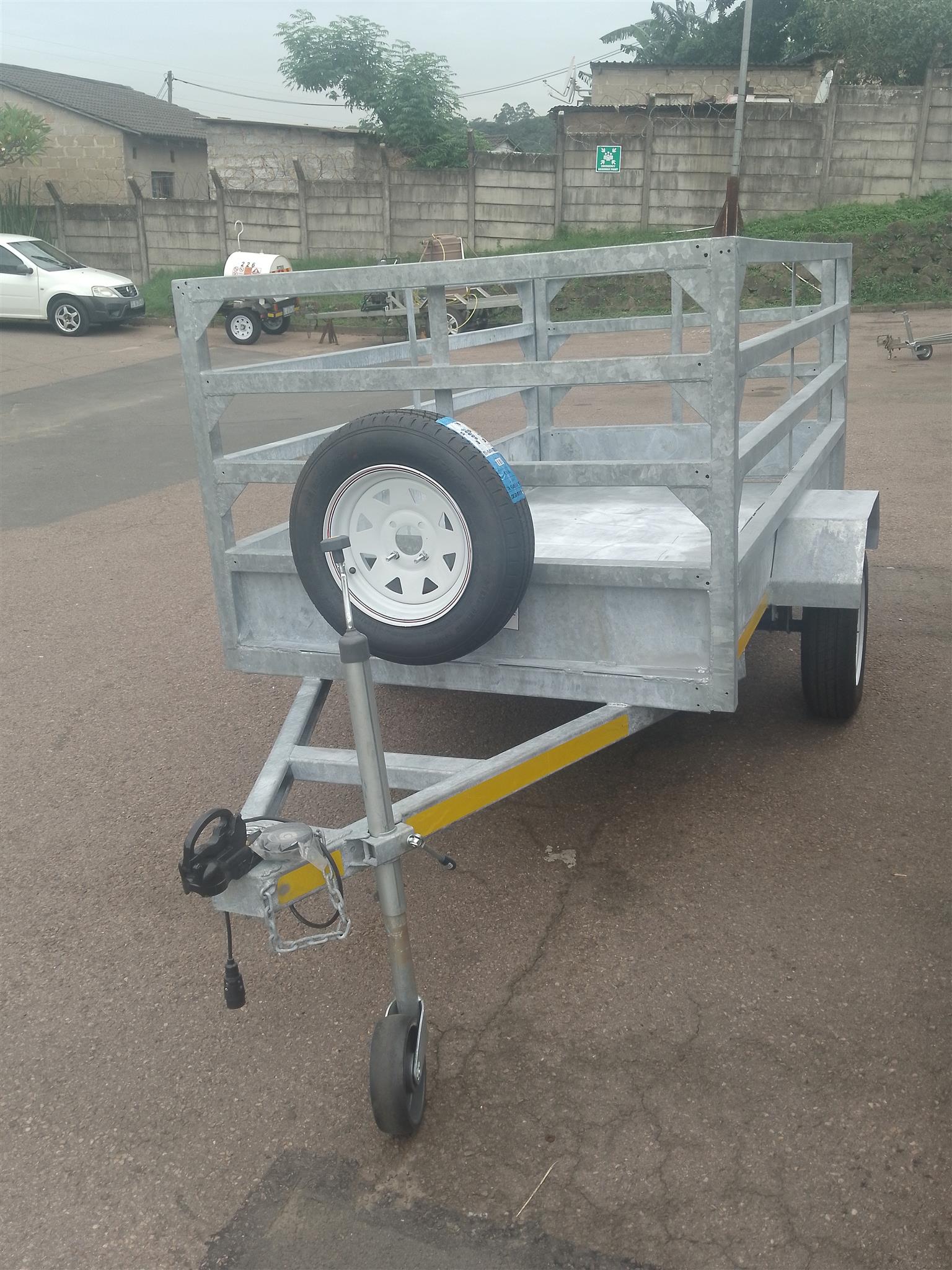2 meter cargo trailer 2450 long 1120 wide 1000 high bin chassis made from 75x38 heavy duty u channel floor made from hot rolled 2.5mm mild steel bars , frames and doors from 50x50mm mild steel 40 mm round axel no brake 750 kg carrying capacity 1 axel 13 inch tires 48 mm Round single wheel jockey wheel 750 kgs non braked cast coupler ( rated 1500kgs ) combo set 4 in one halogen light , brake , park , flickers and license disc light 7 pin trailer plug combo set 4 in one halogen light , brake , park , flickers and license disc light 7 pin trailer plug red 50 mm reflectors on front of mud guard , white 50 mm reflectors on rear of mudguard , mudguards not for standing on standard 1150 mm stick on chevron board on rear with a spare wheel and fully galvanized.