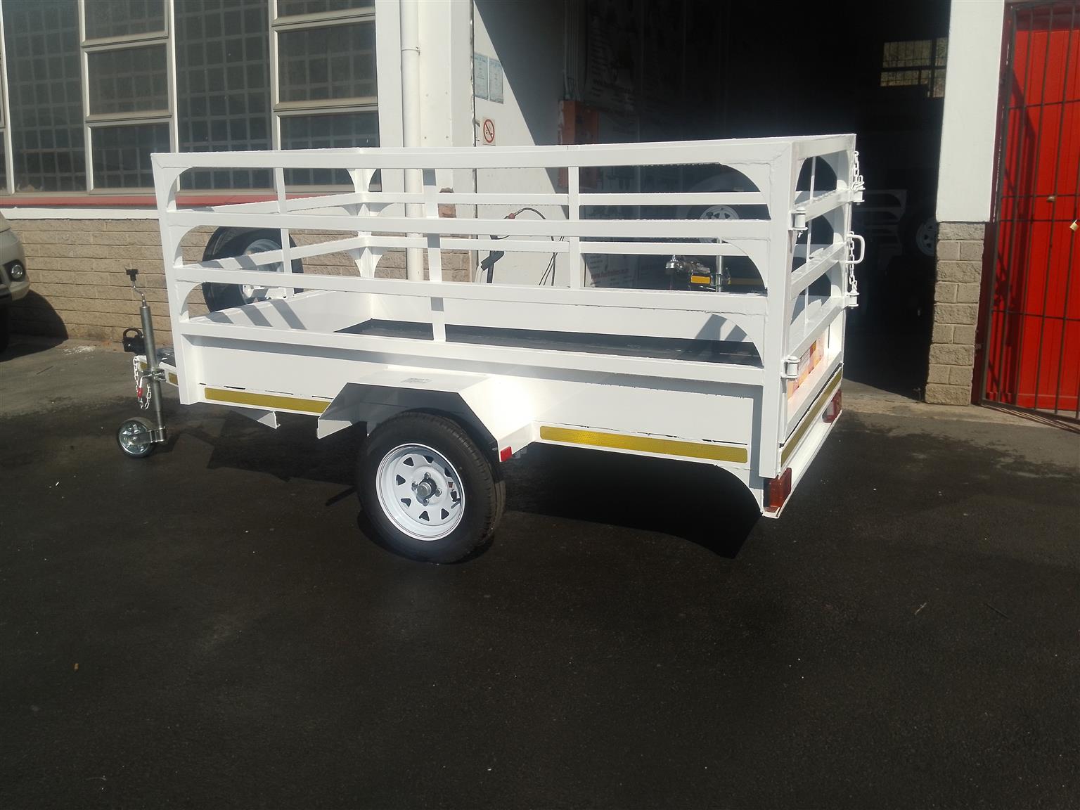 2 meter cargo trailer : 2450 long 1120 wide 1000 high bin chassis made from 75x38 heavy duty u channel floor made from hot rolled 2.5mm mild steel bars , frames and doors from 50x50mm mild steel 40 mm round axle no brake 750 kg carrying capacity 1 axle 13 inch tires.