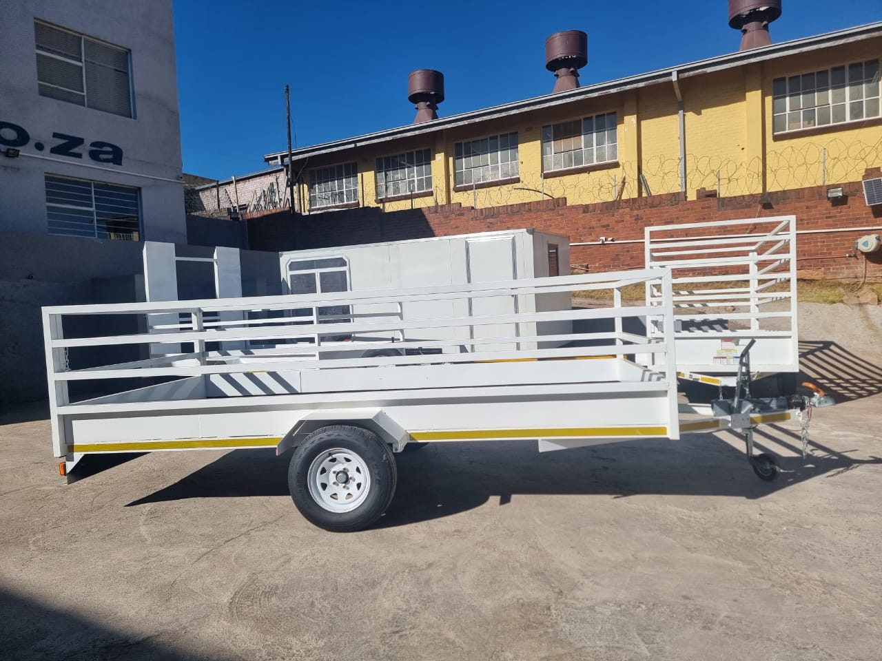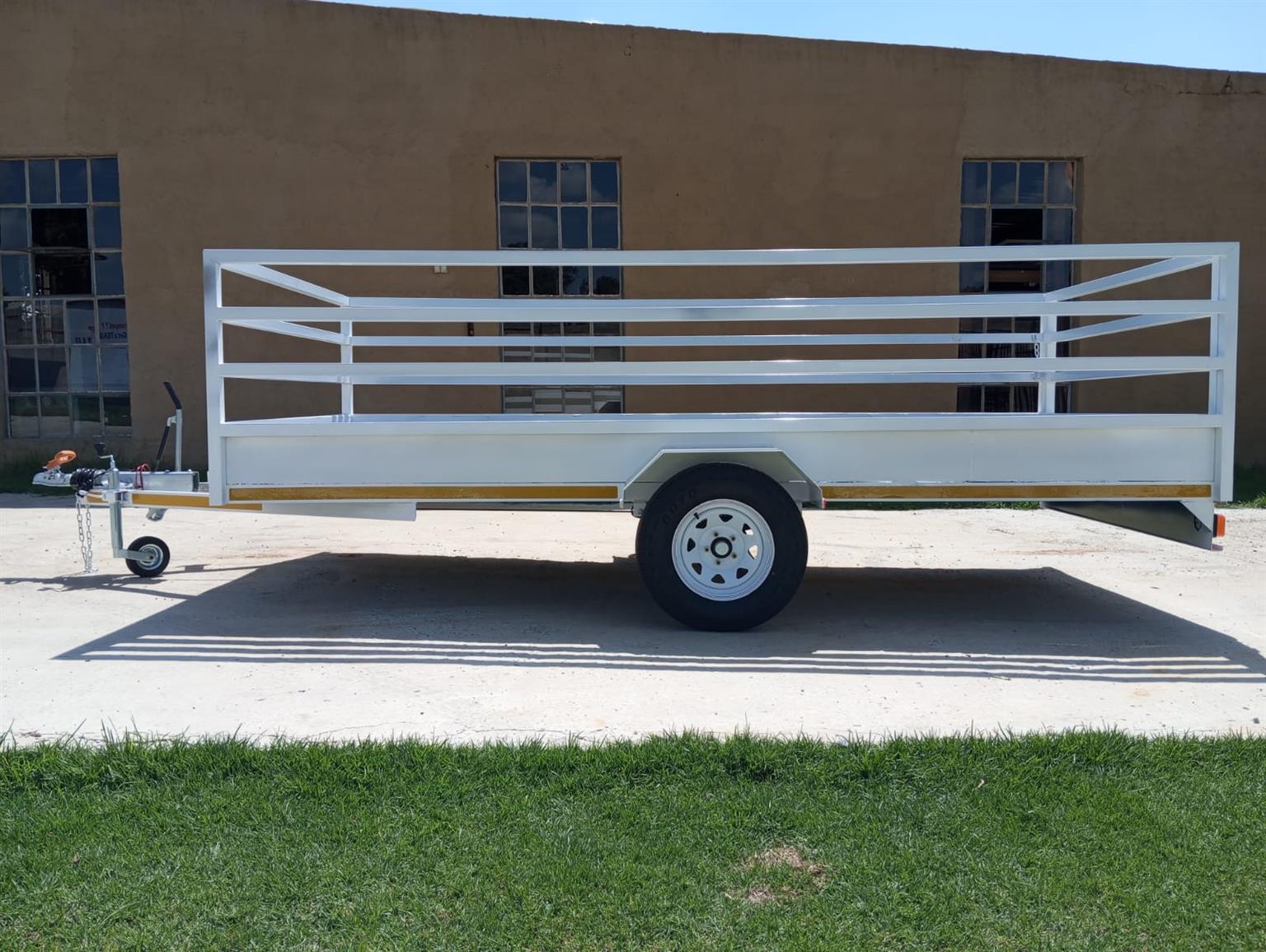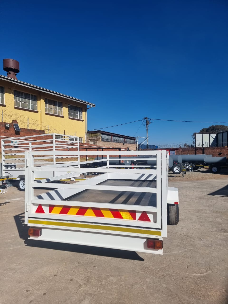 4 meter cargo trailer 4 meters long 1800 wide 1200 high bin dimensions chassis made from 100x50 heavy duty u channel floor made from hot rolled 2.5mm mild steel bars , frames and doors from 50x50mm mild steel 45 mm square axel 1500 kgs carrying capacity braked 1 axel 14 inch tires 48 mm Round single wheel jockey wheel 2.5 ton braked cast iron galvanized coupler with damper combo set 4 in one halogen light , brake , park , flickers and license disc light 7 pin trailer plug combo set 4 in one halogen light , brake , park , flickers and license disc light 7 pin trailer plug red 50 mm reflectors on front of mud guard , white 50 mm reflectors on rear of mudguard , mudguards not for standing on standard 1150 mm stick on chevron board on rear with a spare wheel.