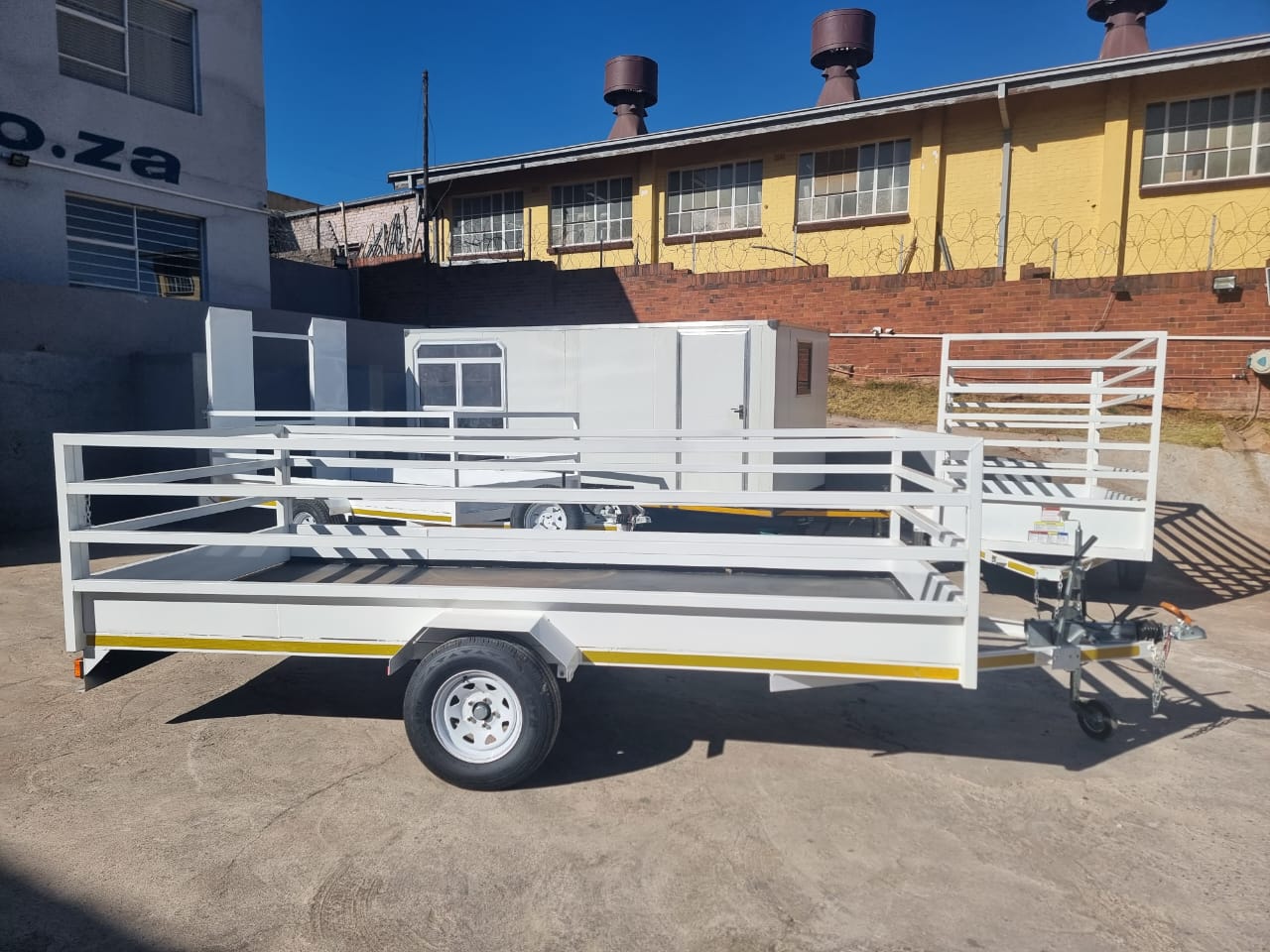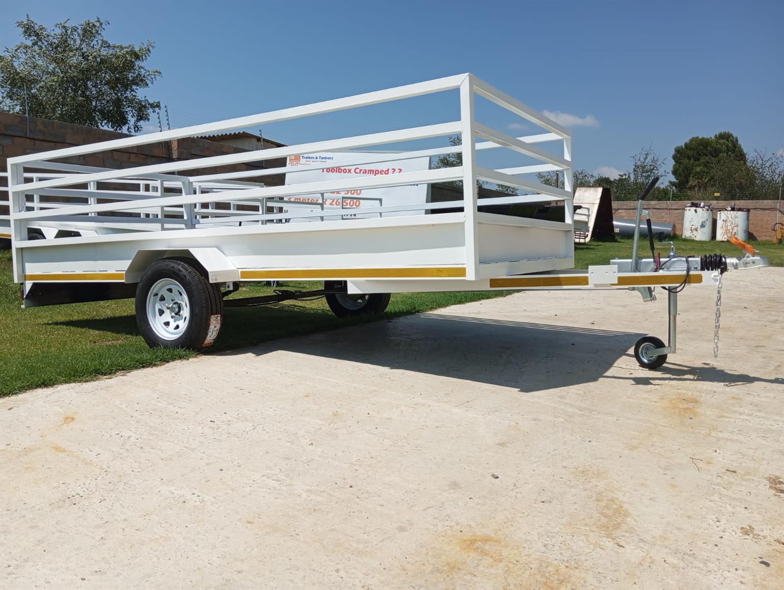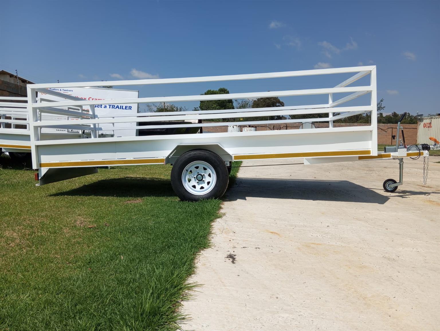 4 meter cargo trailer 4 meters long 1800 wide 1200 high bin dimensions chassis made from 100x50 heavy duty u channel floor made from hot rolled 2.5mm mild steel bars , frames and doors from 50x50mm mild steel 45 mm square axel 1500 kgs carrying capacity braked 1 axel 14 inch tires 48 mm Round single wheel jockey wheel 2.5 ton braked cast iron galvanized coupler with damper combo set 4 in one halogen light , brake , park , flickers and license disc light 7 pin trailer plug combo set 4 in one halogen light , brake , park , flickers and license disc light 7 pin trailer plug red 50 mm reflectors on front of mud guard , white 50 mm reflectors on rear of mudguard , mudguards not for standing on standard 1150 mm stick on chevron board on rear with a spare wheel.