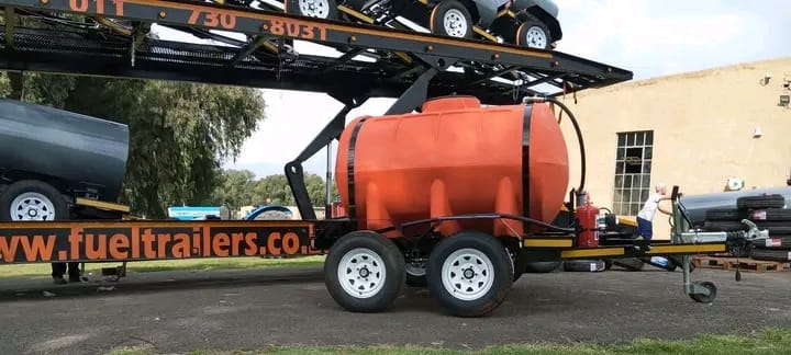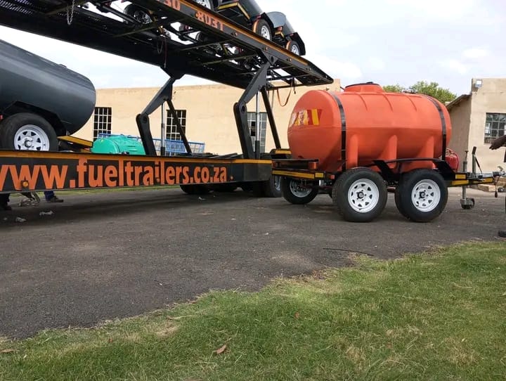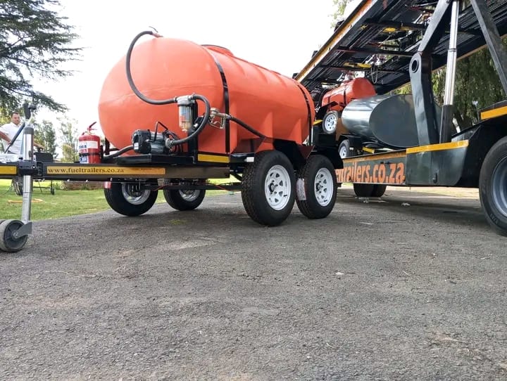 2500 liter polyurethane bowser chassis made from 100x50 heavy duty u channel poly urethane double layer 10mm tank 45 mm square axel 1500 kgs carrying capacity braked 2 axel 14 inch tires 60 mm round Dubbel Jockey wheel 3 ton braked cast iron galvanized coupler with damper combo set 4 in one halogen light , brake , park , flickers and license disc light 7 pin trailer plug combo set 4 in one halogen light , brake , park , flickers and license disc light 7 pin trailer plug red 50 mm reflectors on front of mud guard , white 50 mm reflectors on rear of mudguard , mudguards not for standing on standard 1150 mm stick on chevron board on rear fully equipped with diesel equipment.