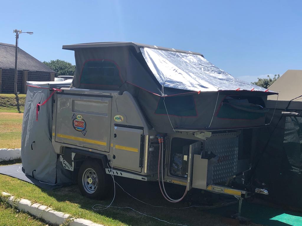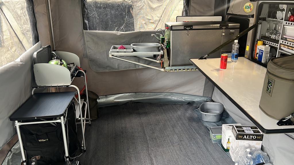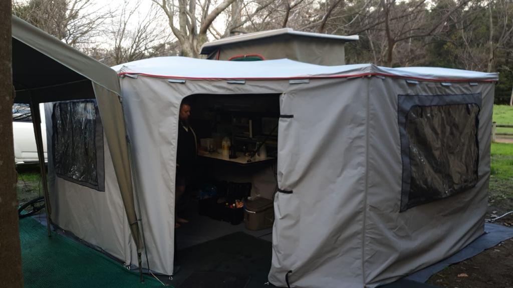 270 awning, full side walls, 90l national luna, fixed solar on roof, flex solar with victron mppt, gas geaser, hot water mixer tap, ekstra lights, laminate floor, extra electric points, inverter, microwave, ground sheets, loose stove and kitchen, silver reflective cover, 2nd deep cycle battery , shower cubicle.