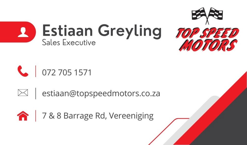 Drive your dream car today with Top Speed Motors, the Vaal’s award-winning used car dealership! Visit our Vereeniging or Vanderbijlpark branches to explore a wide range of quality pre-owned vehicles. We’re AA Dekra affiliated, RMI and MIWA approved, and accredited with all major banks, ensuring a hassle-free financing process. Looking to trade in your car? Our experts offer transparent evaluations to get you the best deal. Don’t wait—your perfect ride is here! Contact Estiaan at for more details.