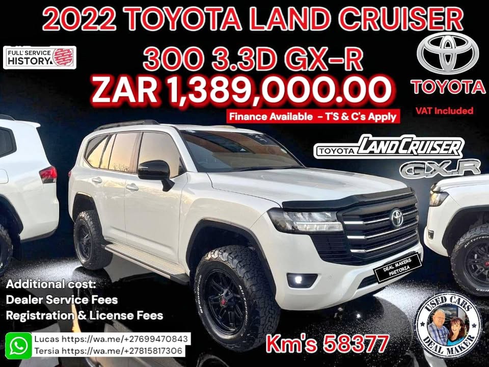 2022 TOYOTA LAND CRUISER 300 3.3D GX-R KM 59377 FULL SERVICE HISTORY ✅Balance of 3-year/100,000km warranty and a 9-service/90,000km service plan ✅Premium Leather Seats ✅New BF Goodrich tyres ✅Gang R Rims ✅Full Viper exhaust ✅OME suspension ✅Reverse camera ✅Bonnet guard ✅7 seater ✅3 keys(2 spare) ZAR 1,389,000.00 FINANCE AVAILABLE T'S & C'S APPLY TRADE-IN'S WELCOME ADDITIONAL COST DEALER SERVICE FEES REGISTRATION & LICENCE FEES DEALER IN GAUTENG More pictures 📸 Available. Contact: WhatsApp or Call Lucas Tersia #LC79 #ToyotaLandCruiser #SellYourLandCruiser #OffRoadCommunity #usedcars #usedcarsforsale #usedcarsnearme #usedcarsforsalebyowners #usedcarsales #usedcardealers #cars #vehicles #gauteng #pretoria #preowned #audi #bmw #volkswagen #haval #chevrolet #mustang #ford #ecosport #fordranger #gwm #toyota #hilux #land cruiser #hyundai #kia #nissan #wbc #weelee #cubbie #4x4 #4you #4everyone
