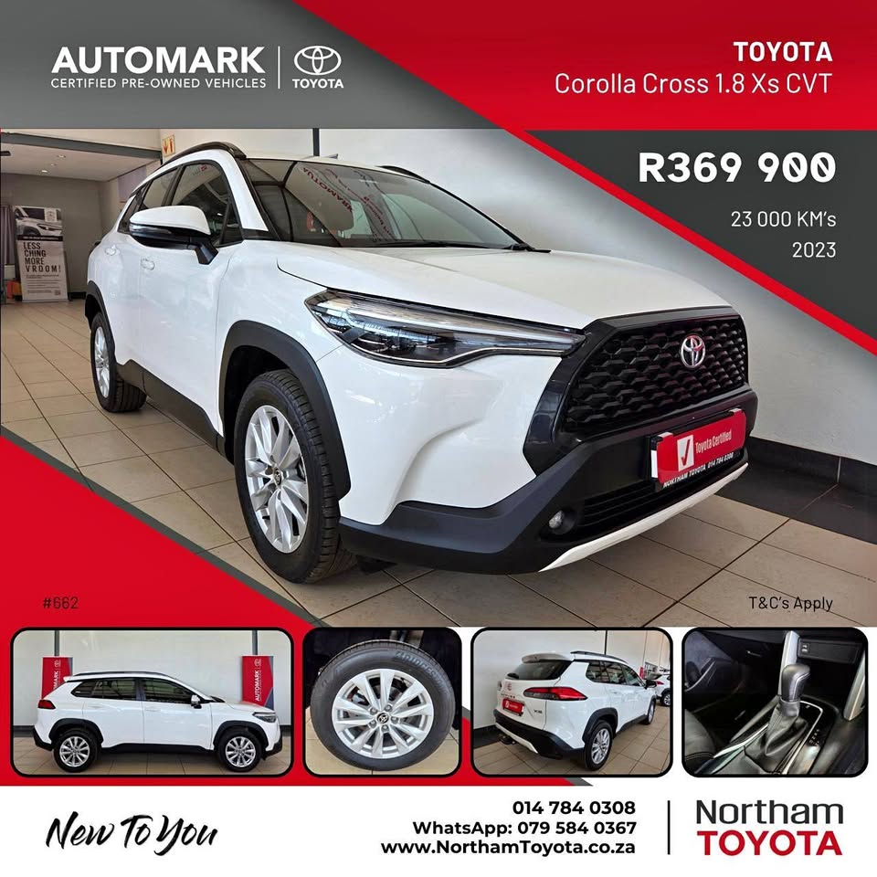 2023 TOYOTA COROLLA CROSS 1.8 XS CVT Km's 23000 Full Service History ZAR 369900.00 VAT INCL. FINANCE AVAILABLE T'S & C'S APPLY TRADE-IN'S WELCOME WHATSAPP
