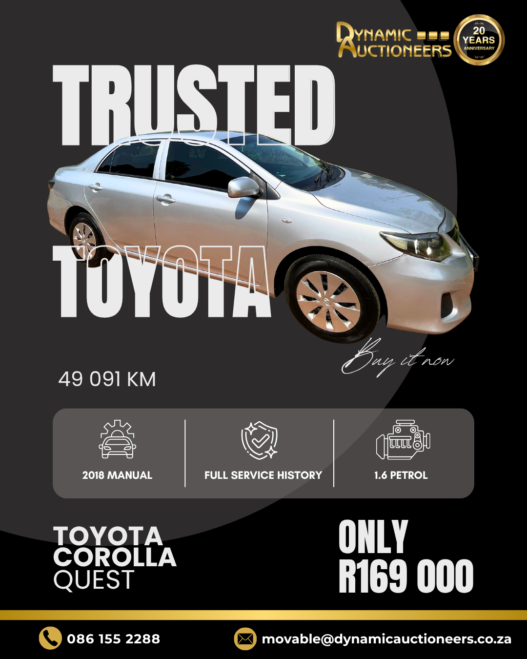 Looking for comfort, quality, and unbeatable value? This 2018 Toyota Corolla Quest 1.6 is the smart choice. With just 49 091 KM, itβs in excellent condition and ready for many more journeys.