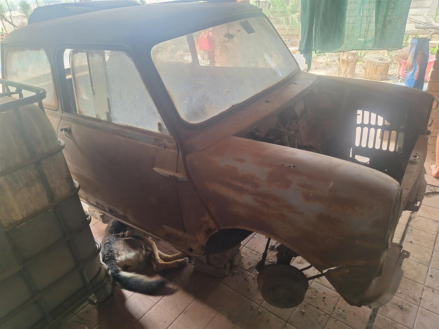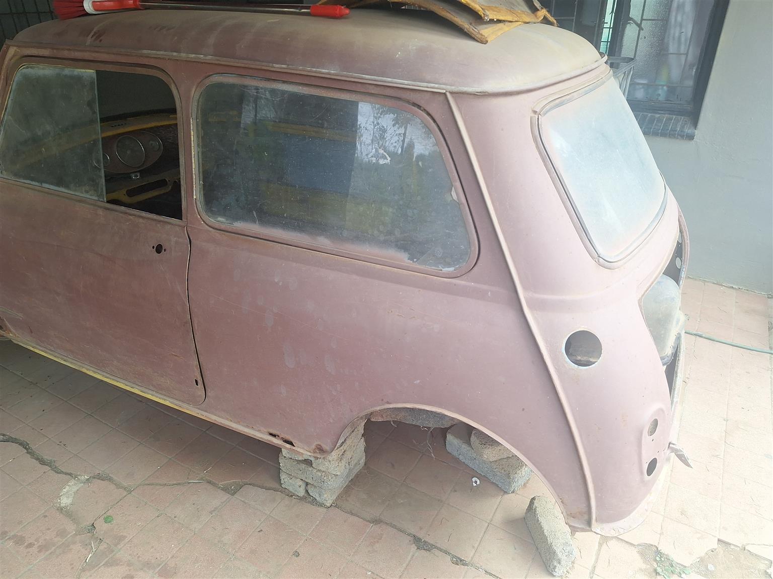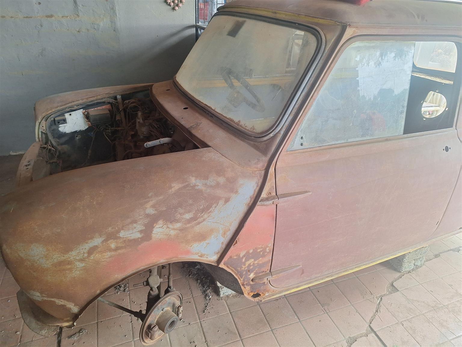 Austin mini, for rebuild, completely stripped, has engine, gearbox, rims. NO PAPERS