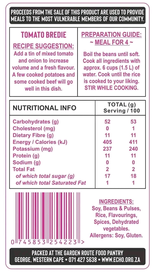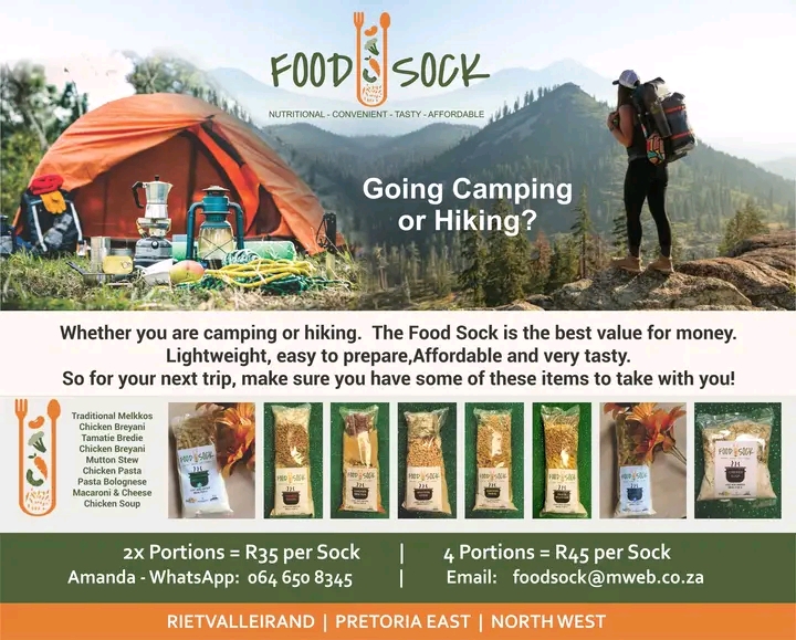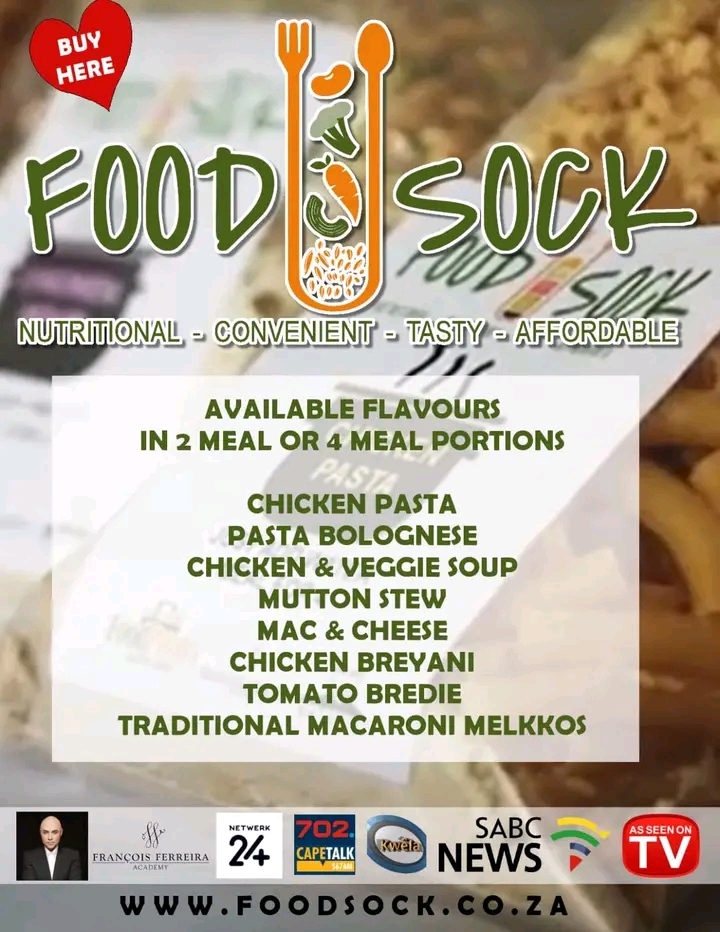 Food sock is a meal that can feed a family of 4 for only R45. It's packed with flavor and nutrients. Quick and easy to prepare just place contents of the packets in boiling water for a couple of minutes and the meal is done.